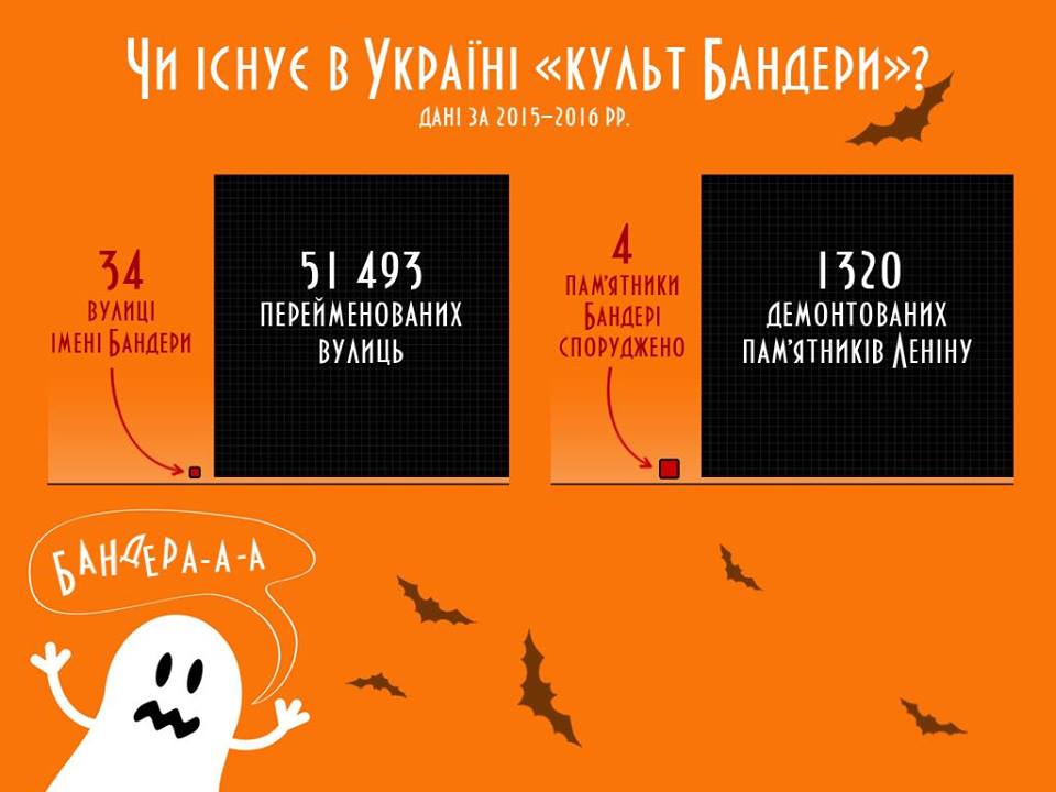 – Из более 50 тысяч переименованных в рамках декоммунизации улиц, площадей и других объектов топонимики только 34 назвали в честь Степана Бандеры (в Закарпатской, Полтавской, Сумской областях и городе Киеве по 1; в Киевской области – 2; в Ивано-Франковской и Николаевской по 3, в Хмельницкой – 4, в Черкасской – 8 и в Черновицкой – 10), – написал он.