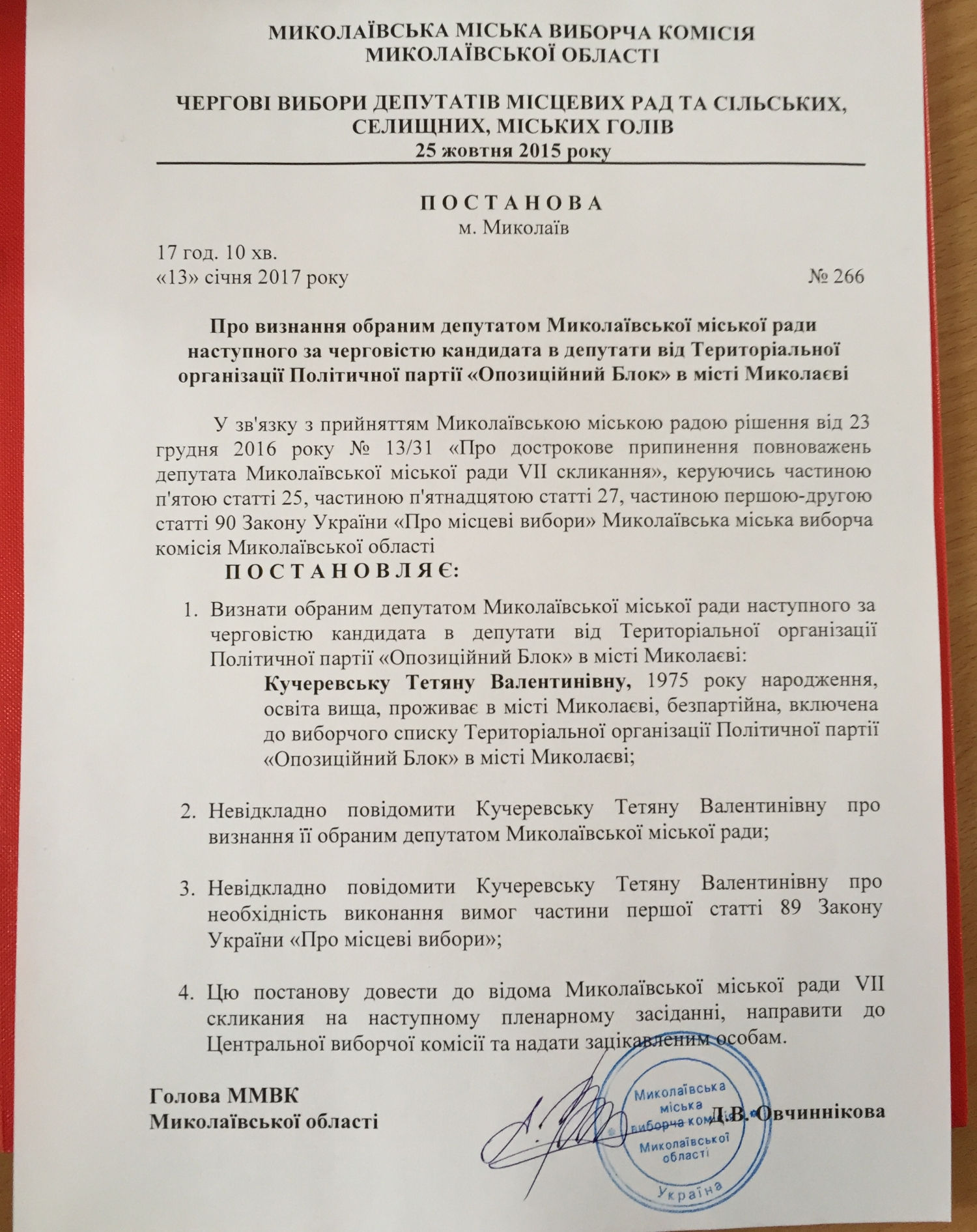Горизбирком постановил признать избранным депутатом Николаевского городского совета следующего по очередности кандидата в депутаты от Территориальной организации политической партии «Оппозиционный блок» в Николаеве Татьяну Кучеревскую.