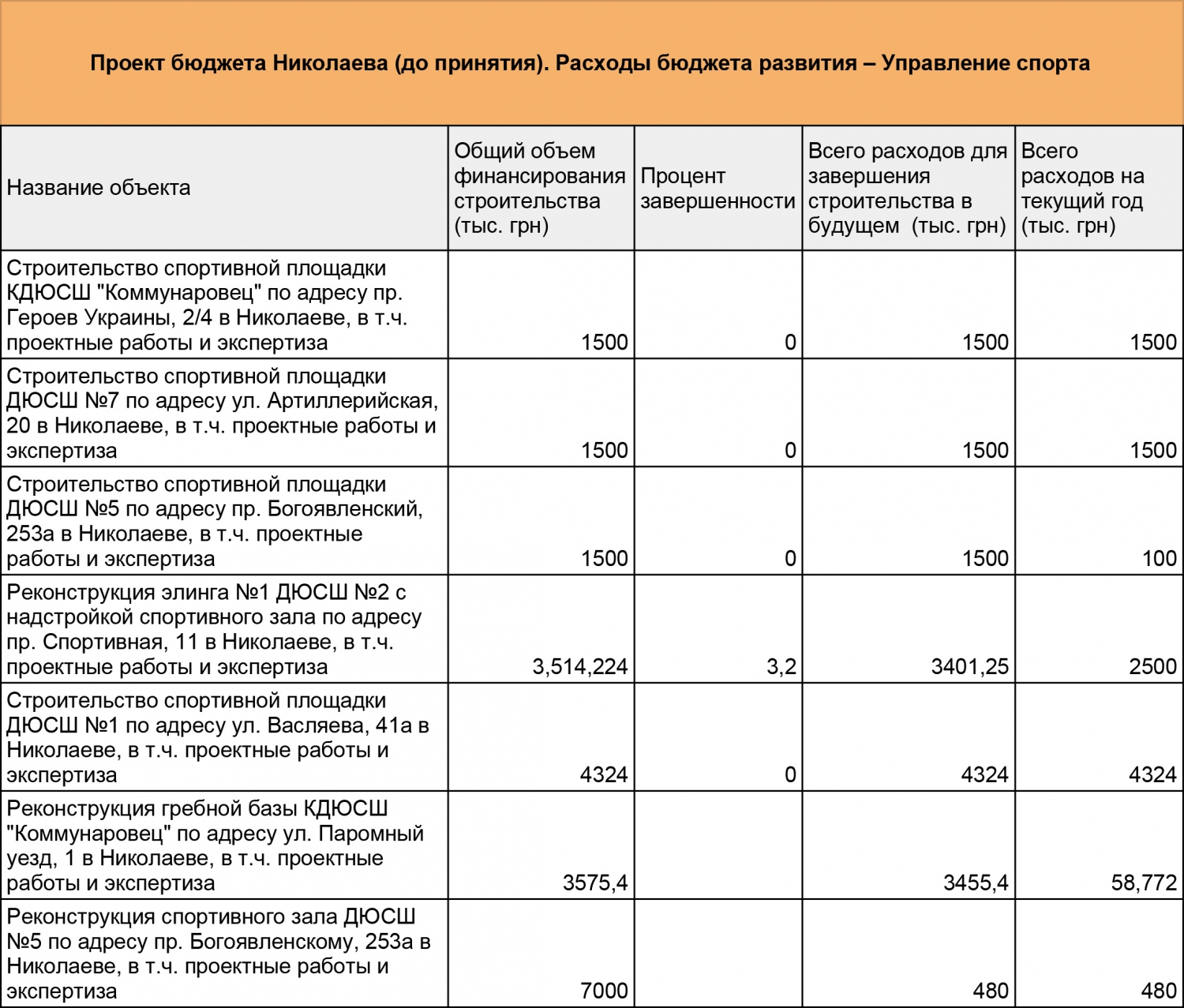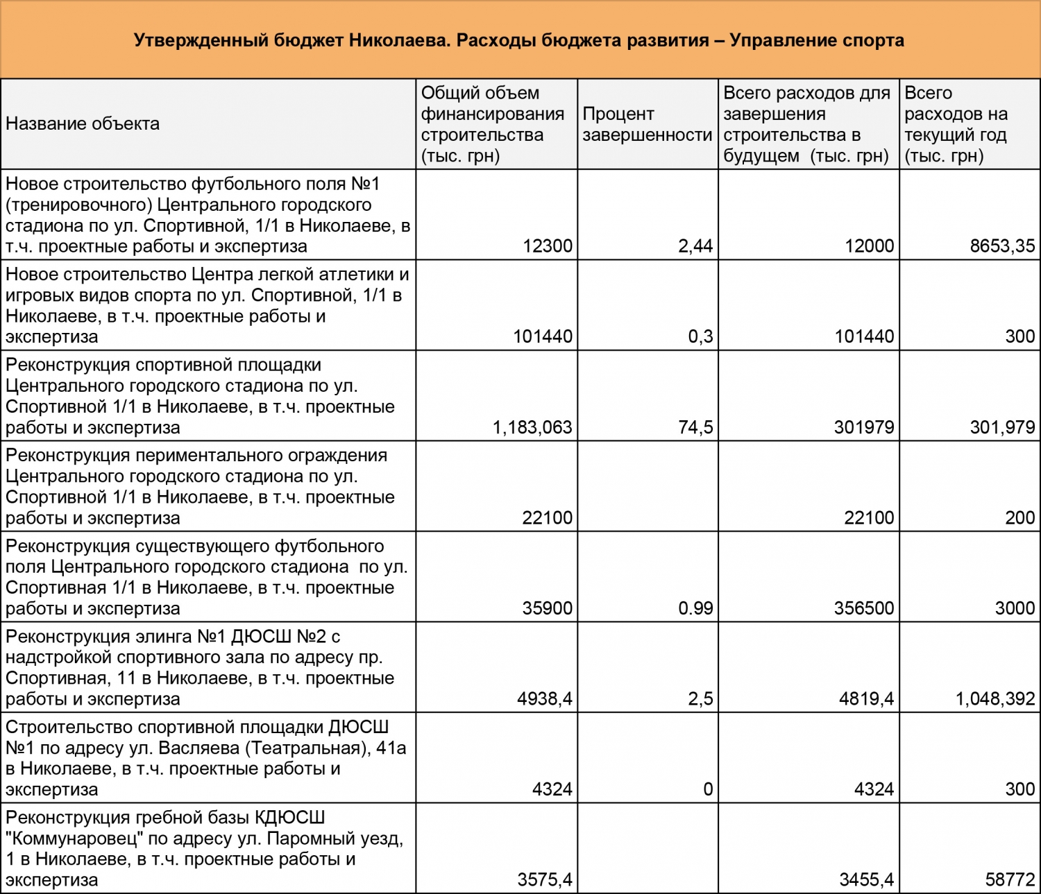В утвержденном и опубликованном на сайте Николаевского горсовета бюджете, фонд развития Управления спорта составляет 31,5 миллионов гривен. При этом, из 8 объектов, которые планируется финансировать в 2017 году, 6 находится по адресу улица Спортивная 1/1 на территории Центрального городского стадиона.