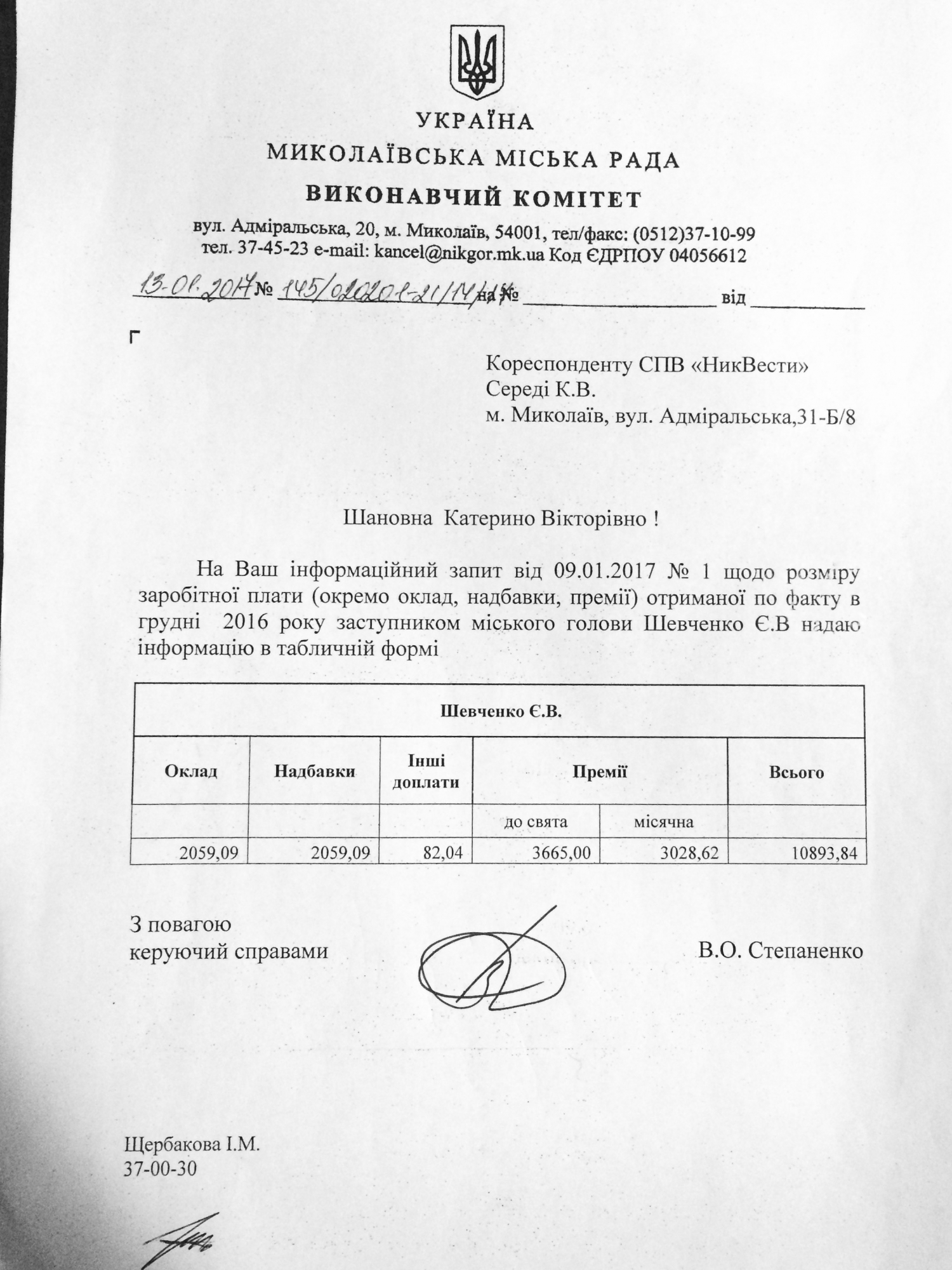 В декабре 2016 года заместитель Николаевского городского головы по социально-гуманитарным вопросам Евгений Шевченко по факту получил 10,8 тысяч гривен зарплаты, с учетом надбавок, премий и других доплат.