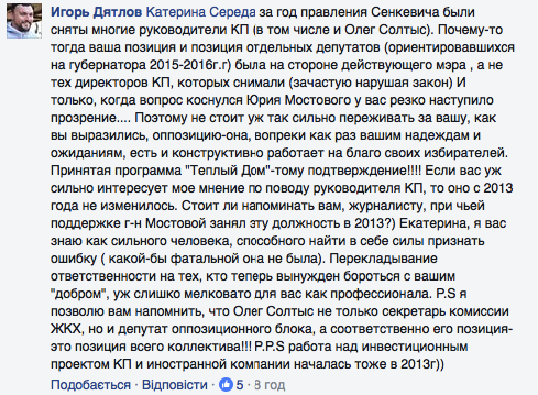 — Если вас уж сильно интересует мое мнение по поводу руководителя КП (Юрия Мостового, - прим.), то оно с 2013 года не изменилось. Стоит ли напоминать вам, при чьей поддержке господин Мостовой занял эту должность в 2013? Я позволю вам напомнить, что Олег Солтыс не только секретарь комиссии по ЖКХ, но и депутат «Оппозиционного блока», а соответственно его позиция — это позиция всего коллектива! - заявил Игорь Дятлов.