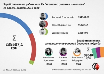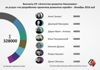 Сотрудники «Агентства развития Николаева» во второй половине декабря получили суммарно 328 тысяч гривен за «разработку проектов развития города». При этом все деньги получили семь так называемых «проектных менеджеров», заработав, таким образом, за декабрь месяц по несколько десятков тысяч гривен.