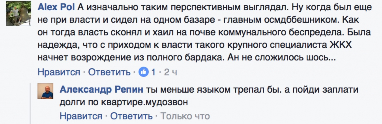 В ответ на это депутат Александр Репин написал: «Ты меньше языком трепал бы. А пойди заплати долги по квартире, мудозвон».