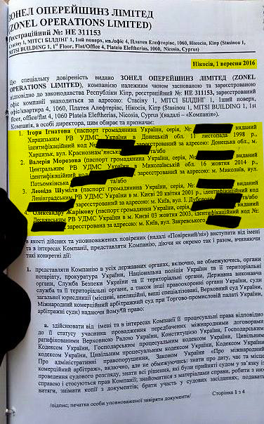 Судя по доверенности, выданной компанией 1 сентября 2016 года на Кипре (город Никосия), представлять интересы «Zonel Operations Ltd» в судах, правоохранительных органах и прочих инстанциях Украины имеют право четверо граждан Украины. А именно, Игорь Игнатов (зарегистрированный в городе Харцызск Донецкой области), Валерий Морозов (Николаев), Леонид Шумило (Киев) и Александра Жарикова (Киев).