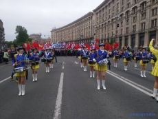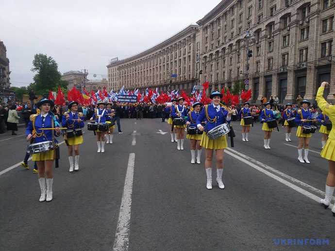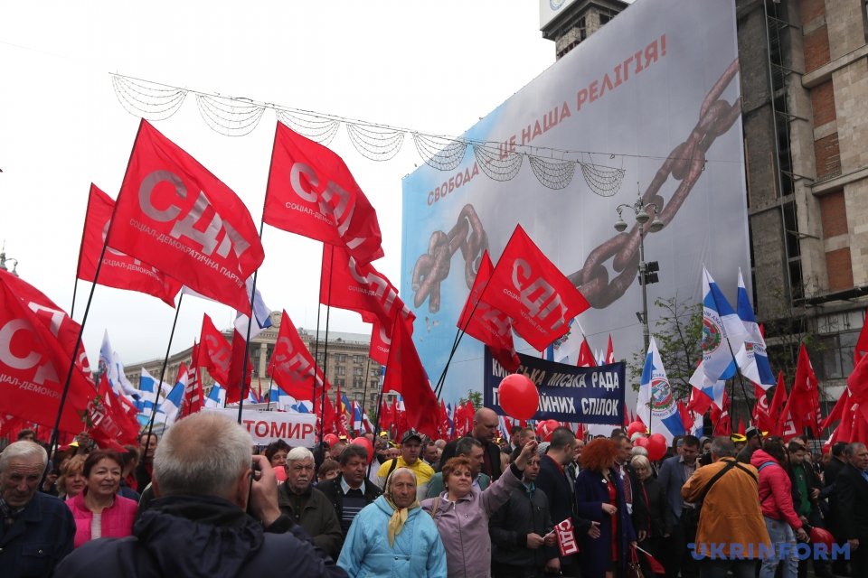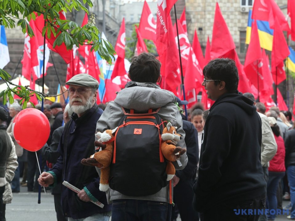 Они несут флаги с надписями «Социал-демократическая партия», «Киевский городской совет профсоюзов», флаги Украины и воздушные шарики красного цвета с надписью 1 мая. Также они держат плакаты со словами: «Первомаю быть», «За мир, труд, справедливость» и другие, сообщает Укринформ.