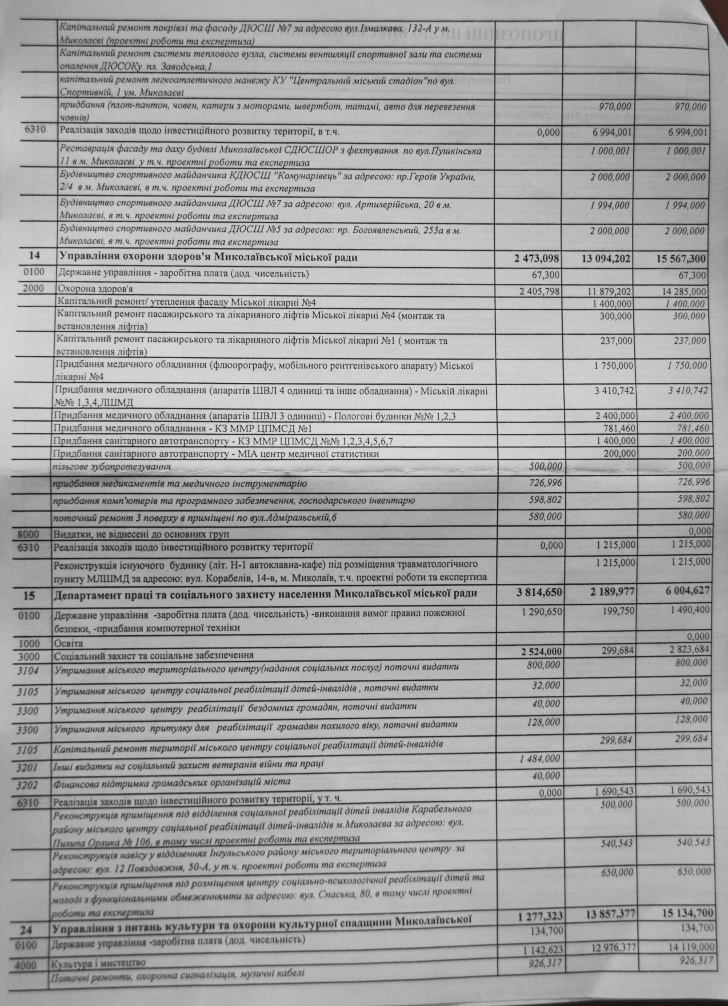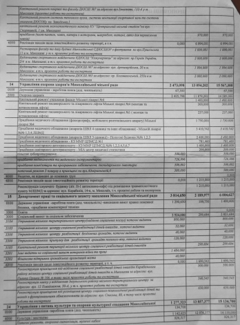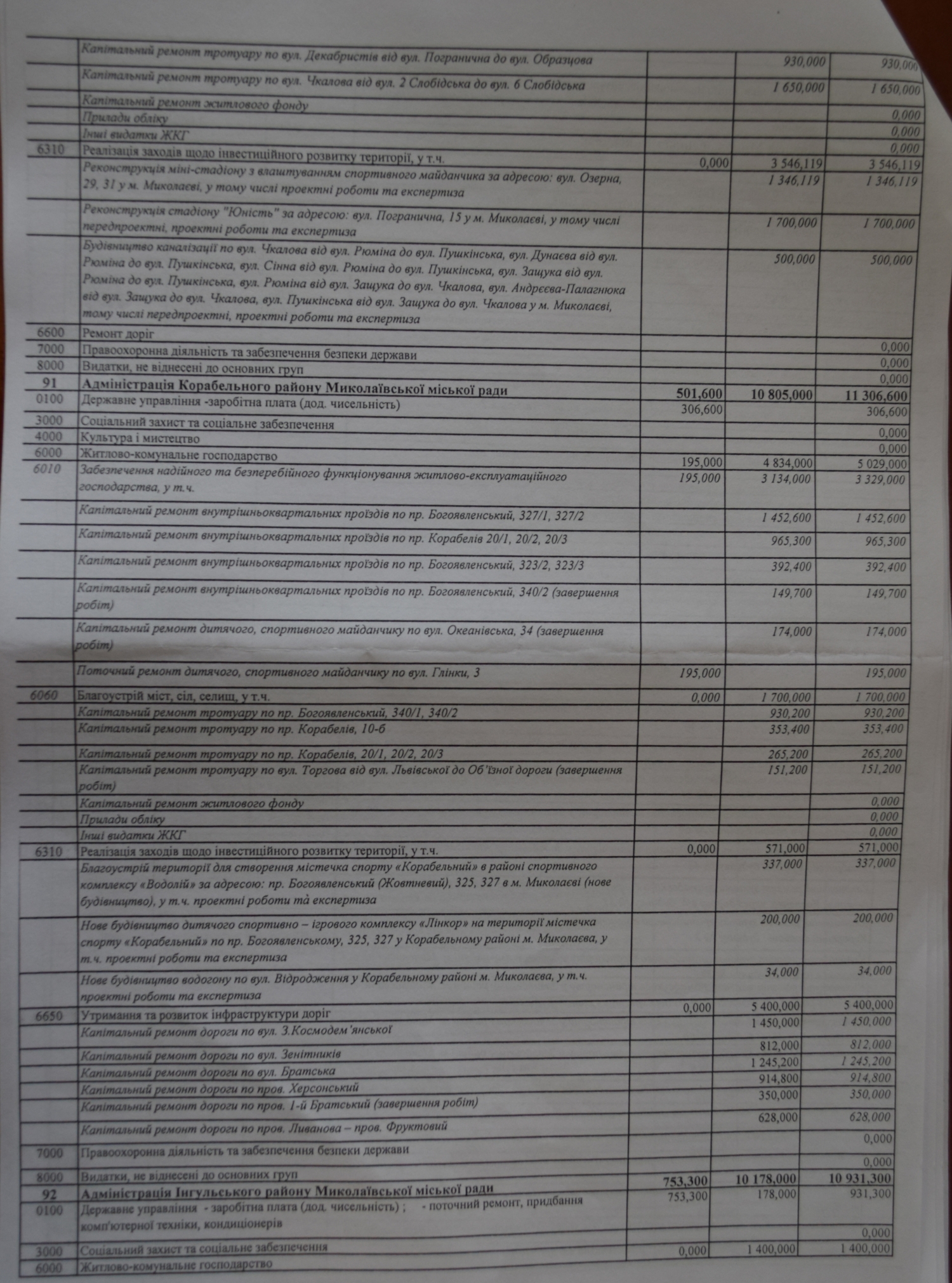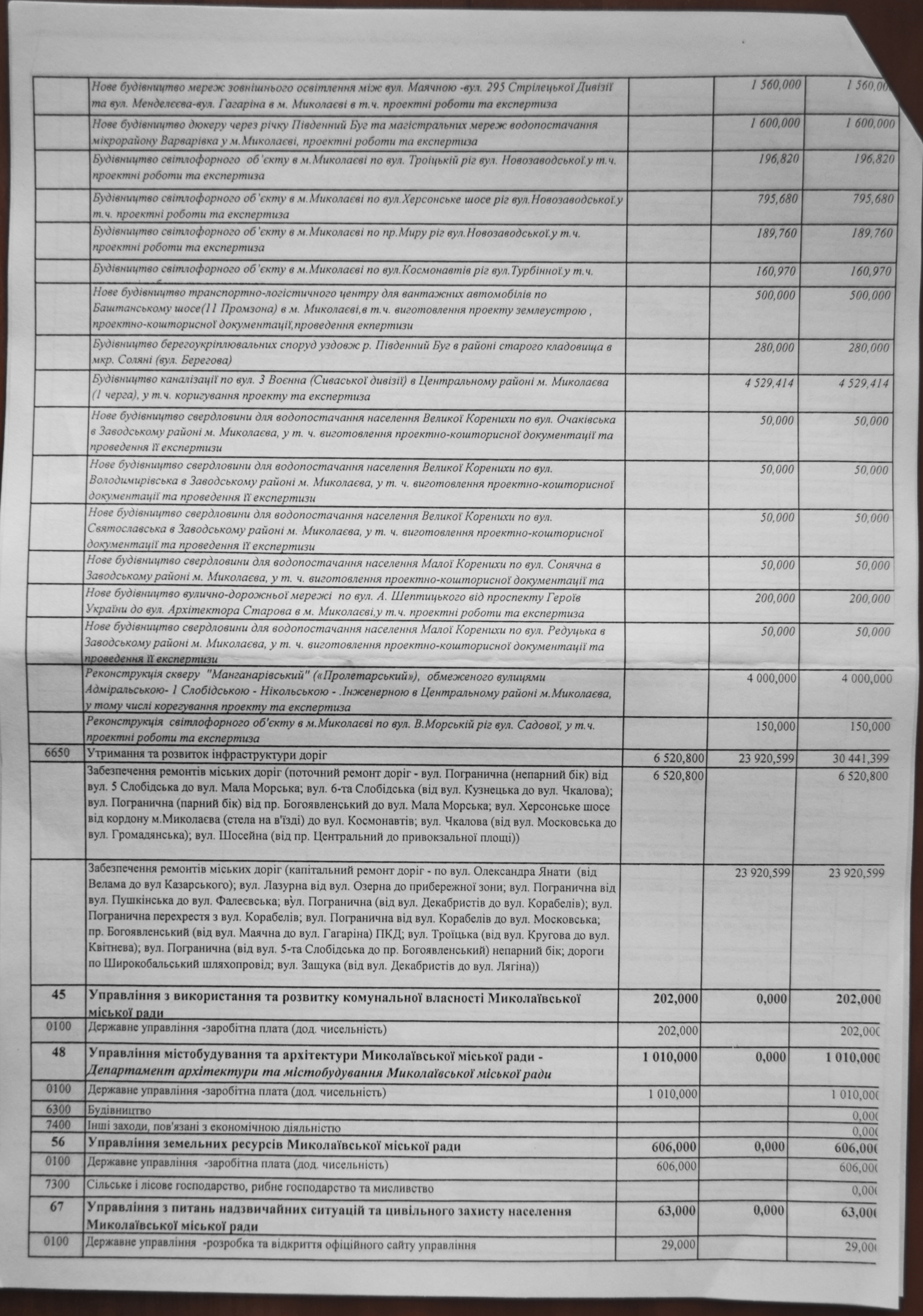 Согласно росписи предлагаемых изменений в бюджет, планируется выделение дополнительного финансирования увеличенного на 200 человек штата сотрудников структурных подразделений мэрии. На зарплату новых чиновников, а также содержание новосозданных подразделений горсовета планируют выделить из основного фонда и бюджета развития дополнительно 23 миллиона 84 тысячи гривен. В частности, на функционирование Департамента энергетики, энергосбережения и внедрения инновационных технологий, который подчиняется представителю «Оппозиционного блока», вице-мэру Александру Омельчуку, предусмотрено выделение почти 2,3 миллионов гривен. На работу Департамента внутреннего финансового контроля, надзора и противодействия коррупции, который возглавил Андрей Ермолаев, соратник мэра Николаева Александра Сенкевича, предлагается выделить 4 миллиона гривен. На работу управления капитального строительства, реформированного из коммунального предприятия, планируется выделить 1,7 миллиона гривен. Еще 1,4 миллиона гривен предусмотрено для обеспечения функционирования созданного Управления государственного архитектурно-строительного контроля Николаевского горсовета.