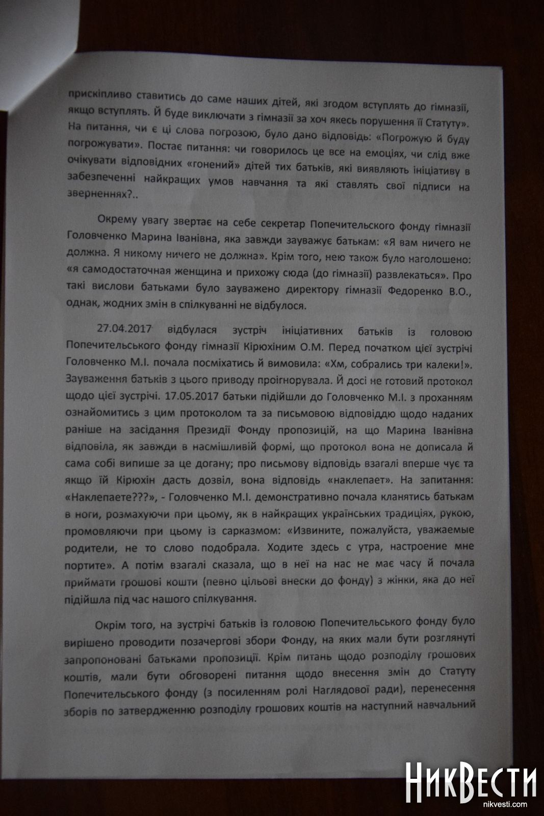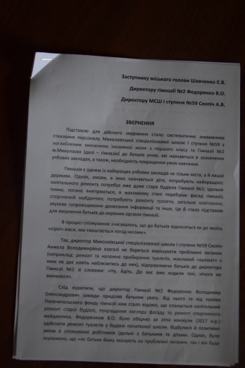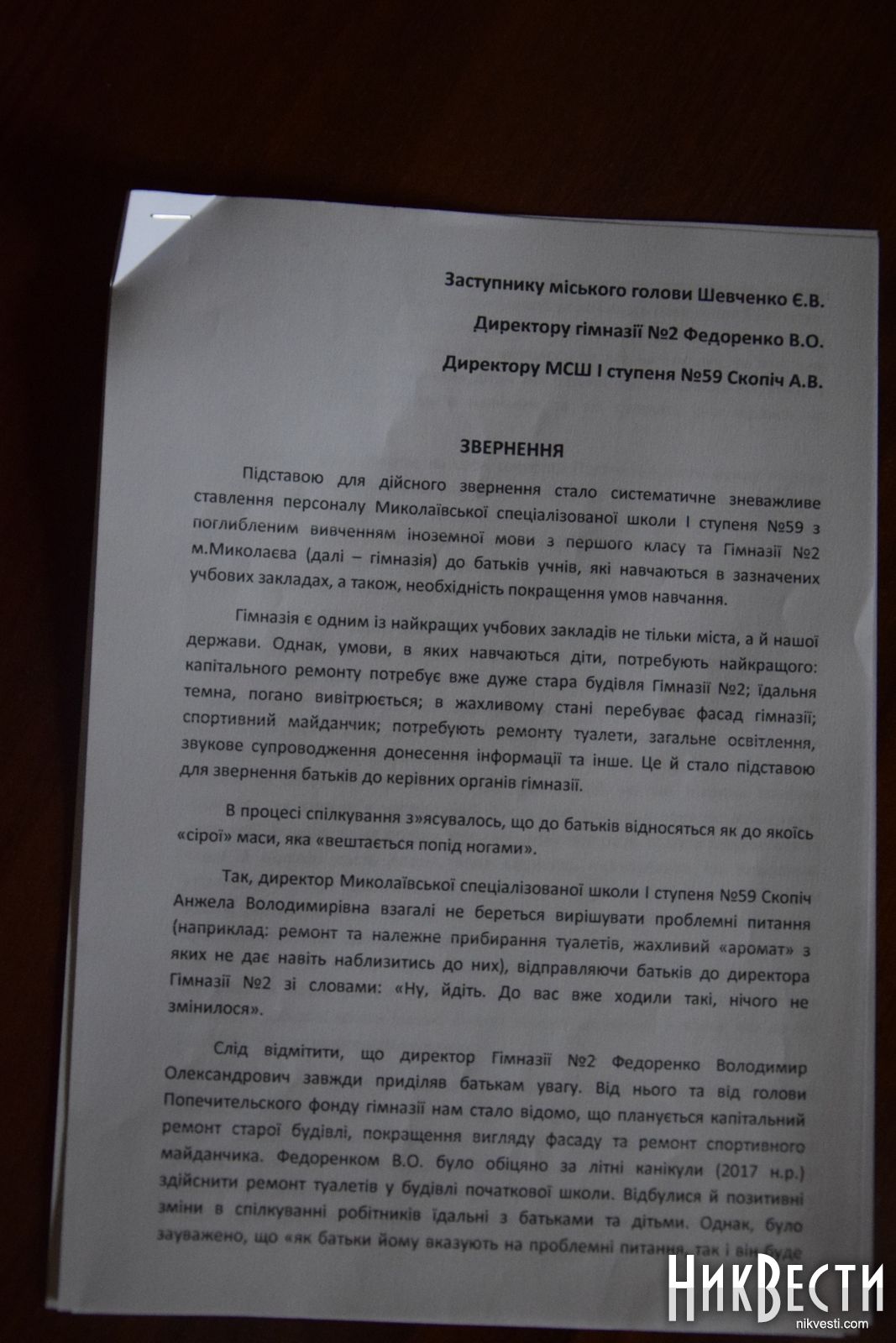 В понедельник, 22 мая, родители учеников начальных классов средней школы № 59, которая находится в одном здании с гимназией №2, пришли к заместителю Николаевского городского головы Евгению Шевченко, чтоб рассказать о непрозрачности использования денег, которые ежемесячно сдают в фонд попечительского совета.