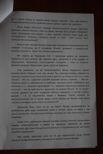По их словам, каждый месяц эта сумма составляет примерно 42 тысячи гривен. Они указали, что после их инициативы контролировать ход траты этих денег на них начали оказывать давление директор гимназии №2 Владимир Федоренко и глава попечительского фонда.