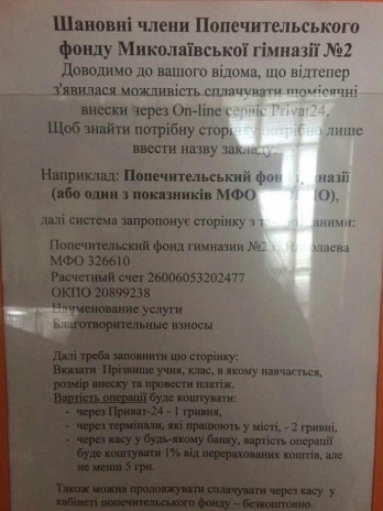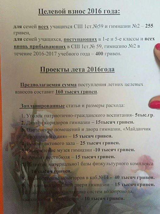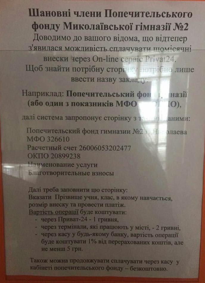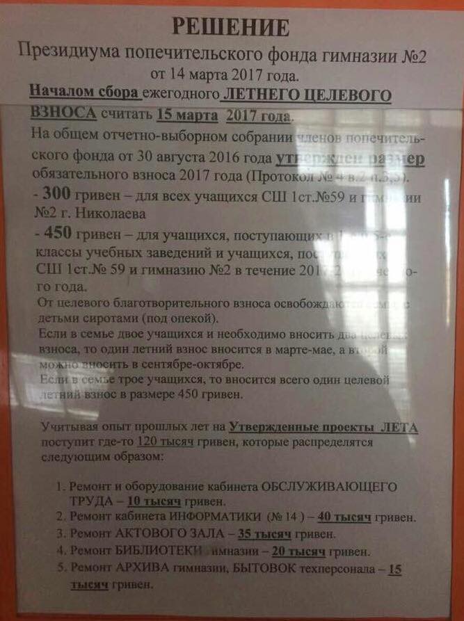 В опубликованных документах указывается, что «попечительский фонд гимназии №2» утвердил 30 августа 2016 года размер обязательного взноса 2017 года: 300 гривен для всех учащихся школы №59 и гимназии №2 Николаева, 450 гривен — для тех, кто поступает в 1 и 5 классы школ.