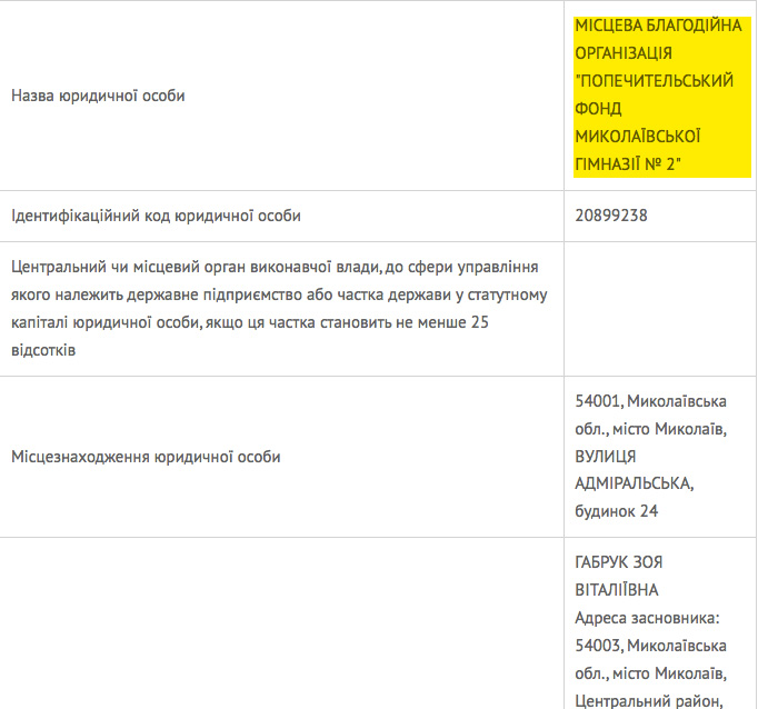 По данным Единого государственного реестра юридических лиц, Местная благотворительная организация «Попечительский фонд Николаевской гимназии №2» зарегистрирована в 2012 году по улице Адмиральской, 24. Учредителями организации являются Габрук Зоя Витальевна, Кирюхин Олег Михайлович, Федоренко Владимир Александрович.