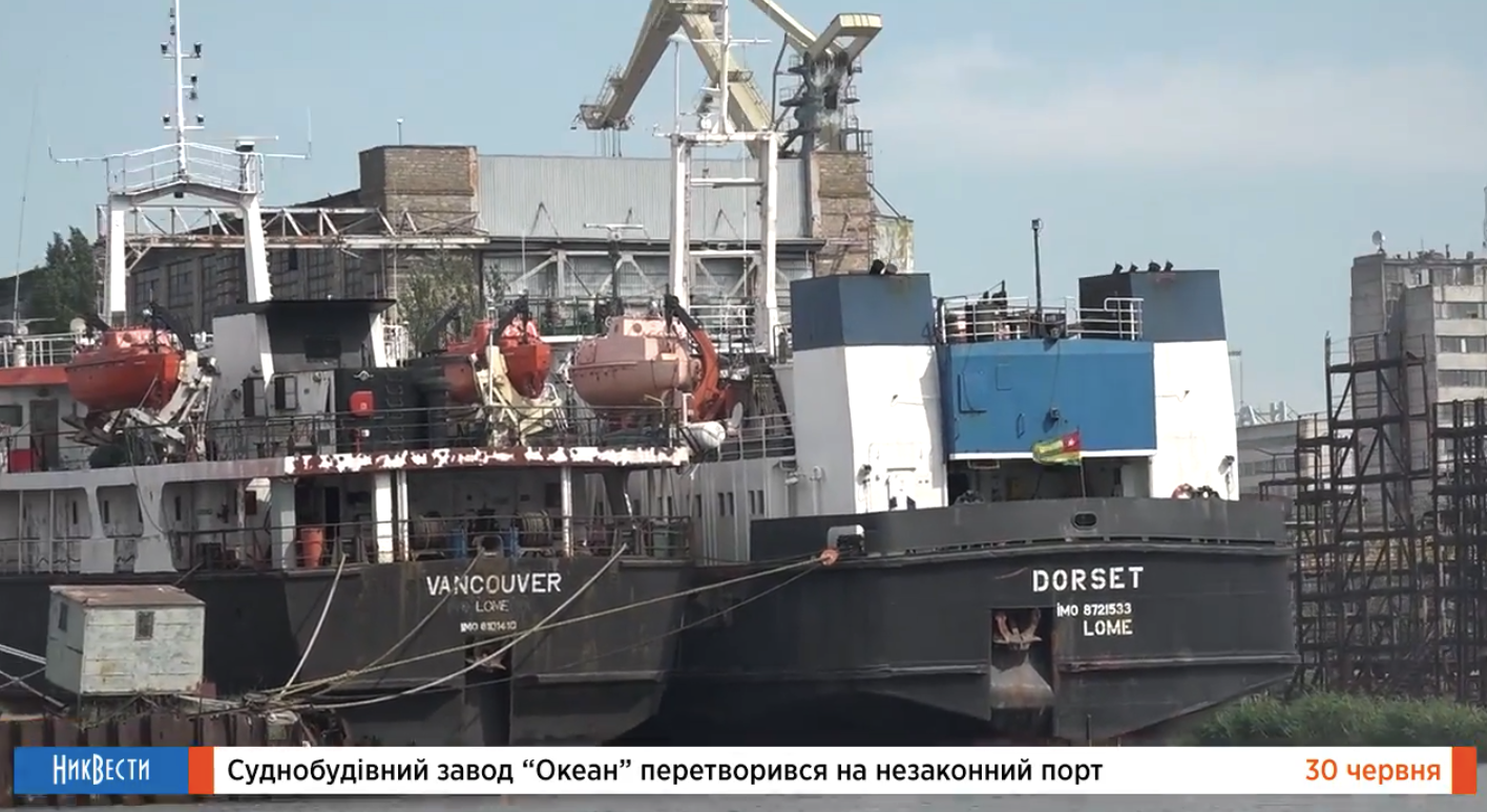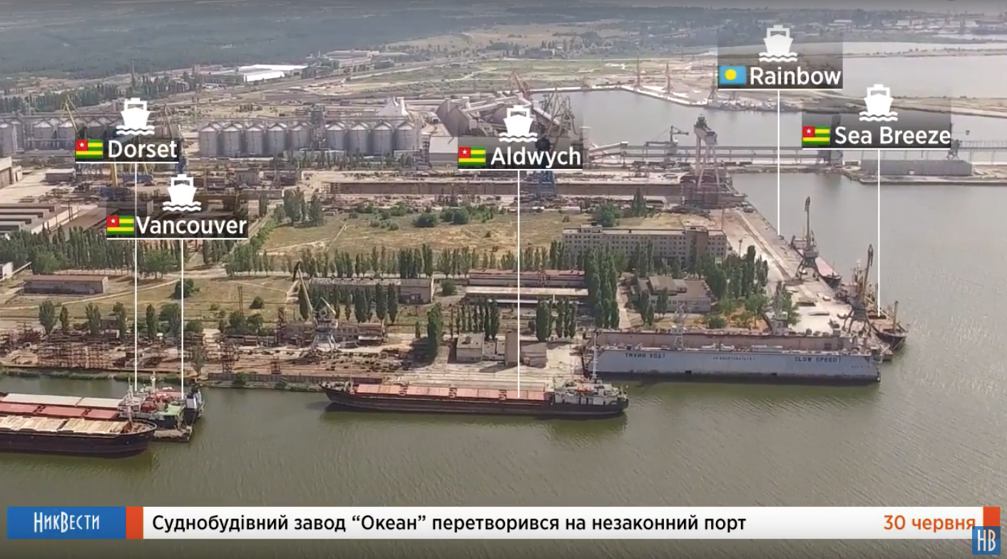 Но суда вновь и вновь продолжают заходить в арестованную акваторию и пользоваться ресурсами завода для перегрузки и хранения грузов. Так 23 июня съемочная группа НикВестей зафиксировала пять грузовых судов, которые пришвартовались у причалов завода «Океан». Это «Rainbow», «Sea Breeze», «Vancouver», «Dorset» и «Aldwych». Четыре из них под флагом республики Того. Один имеет местом регистрации республику Палау. Еще несколько лет назад эти суда были российской собственностью и ходили под флагом России.