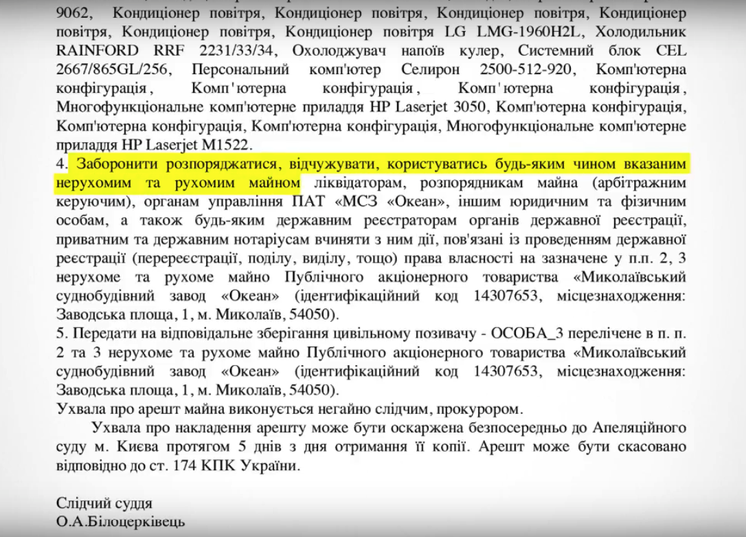 В свою очередь, капитан Николаевского морского порта, который в соответствии с законодательством осуществляет оформление захода судна в порт, отметил, что знает и постоянно отчитывается о том, что на имущество завода «Океан» наложен арест, там запрещена любая хозяйственная деятельность. Однако, по его словам, на него оказывается давление со стороны отдельных народных депутатов Украины, фамилии которых он не назвал.