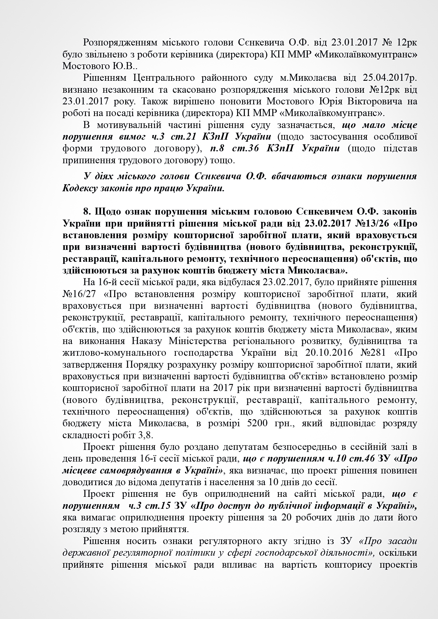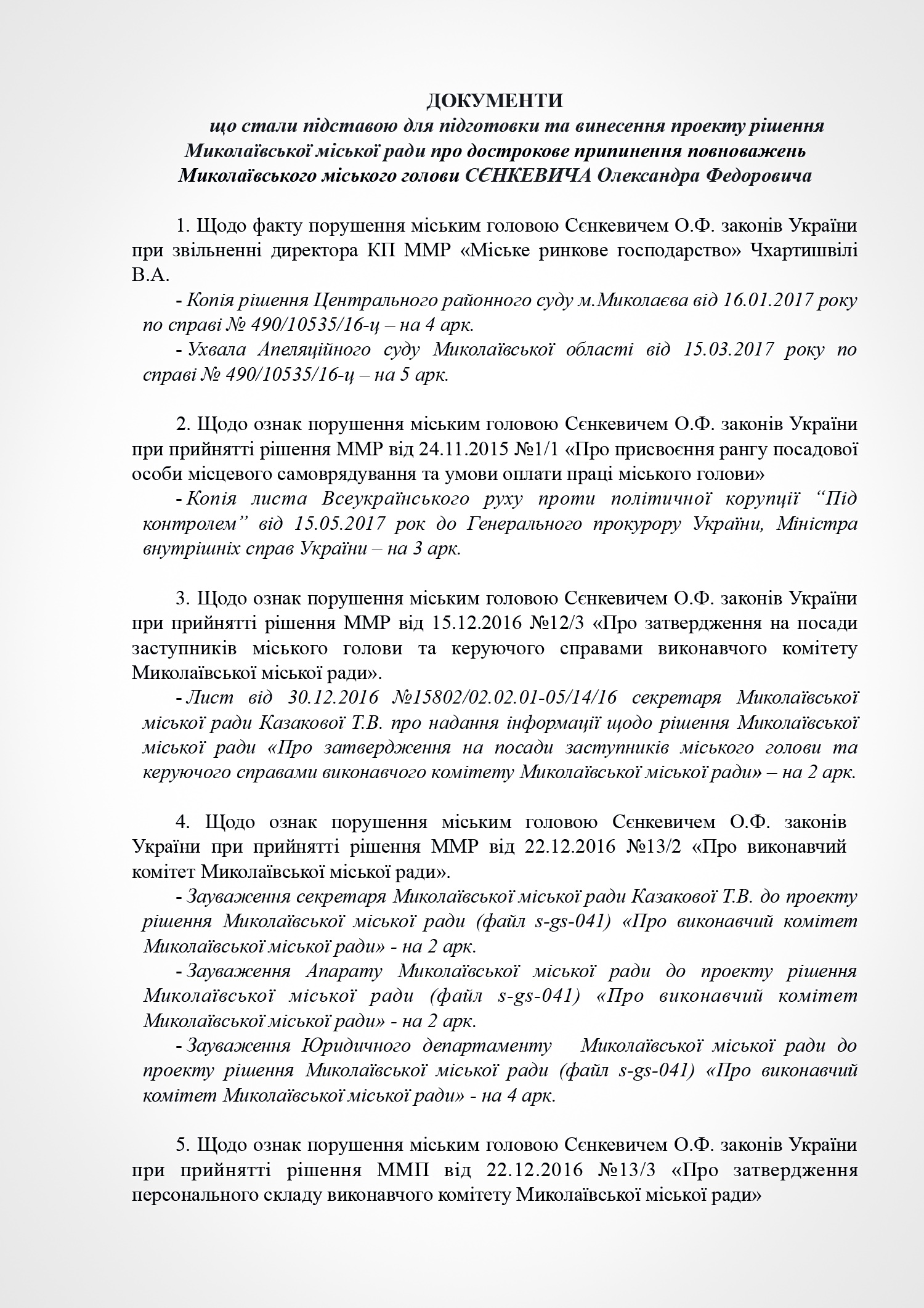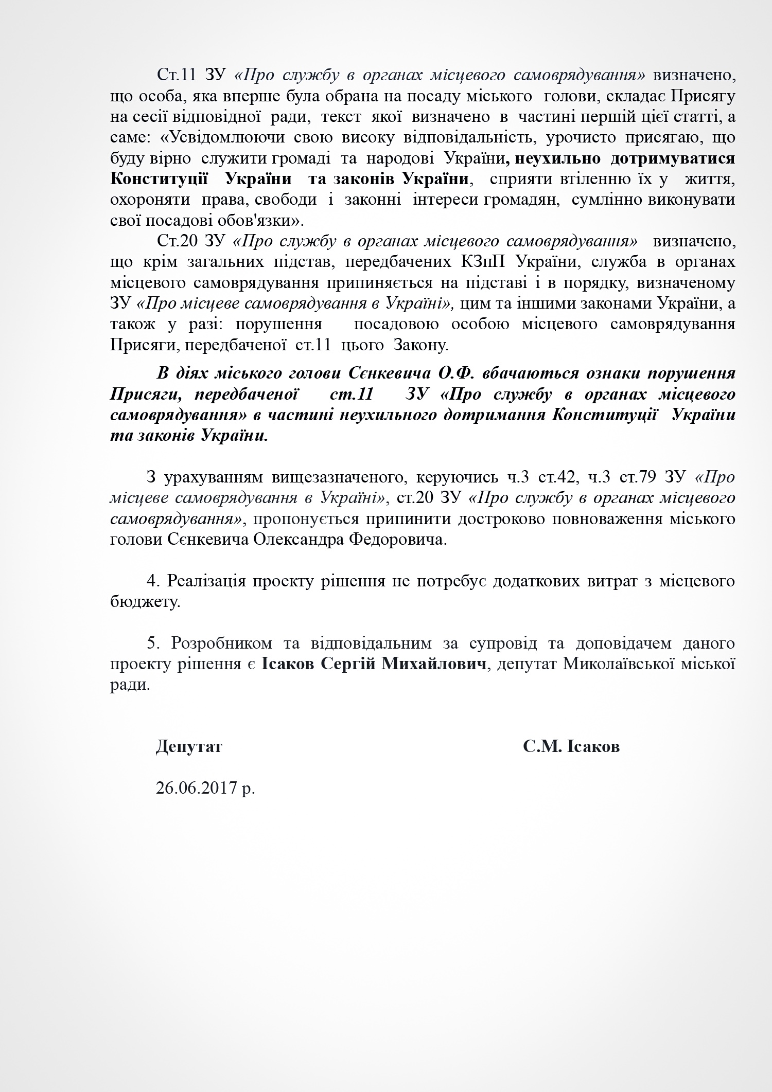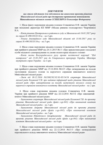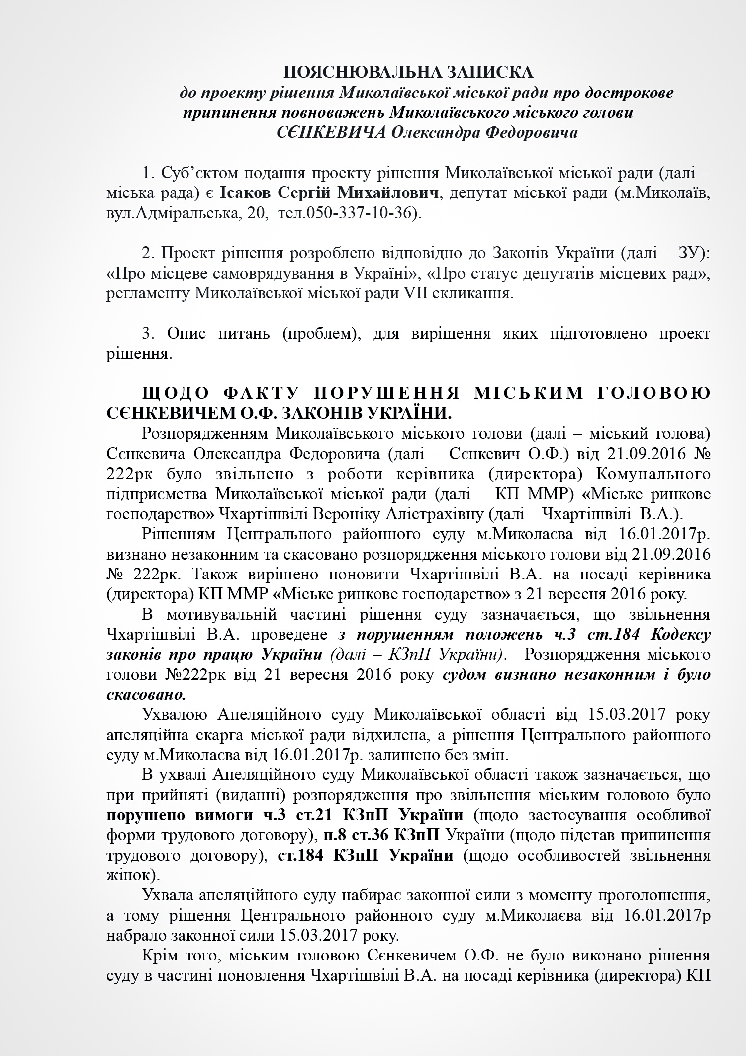 В пояснении к проекту решения субъект подачи документа указывает на признание судом факта нарушения Николаевским городским головой Александром Сенкевичем части 3 статьи 184 Кодекса законов о труде Украины, а также наличие в действиях Николаевского городского головы признаков нарушений части 2 статьи 19, статьи 43, статьи 1291 Конституции Украины; части 3 статьи 21 пункта 8 статьи 36, части 3 статьи 184 Кодекса законов о труде Украины; части 1, 2 статьи 172-7 Кодекса Украины об административных правонарушениях; статьи 366, 382 Уголовного кодекса Украины; части 10 статьи 46, части 5 статьи 47, части 4 статьи 59, части 1 статьи 59-1 Закона Украины «О местном самоуправлении в Украине»; части 2 статьи 28 Закона Украины «О статусе депутатов местных советов»; пунктов 2,3 части1 статьи 28 части 2 статьи 35 Закона Украины «О предотвращении коррупции»; части 3 статьи 15 Закона Украины «О доступе к публичной информации в Украине»; ст. 34 Закона Украины «Об основах государственной регуляторной политики в сфере хозяйственной деятельности»; статьи 4, 11 Закона Украины «О службе в органах местного самоуправления».