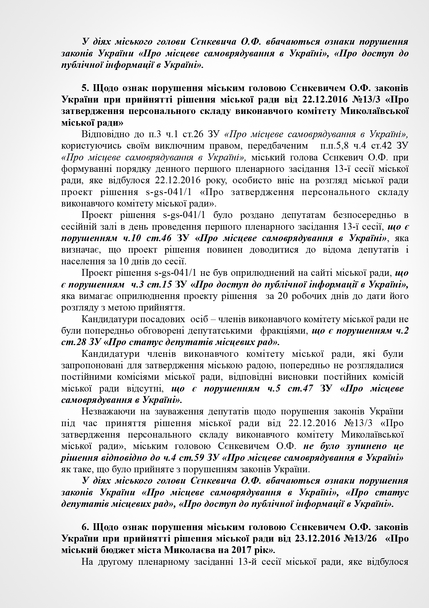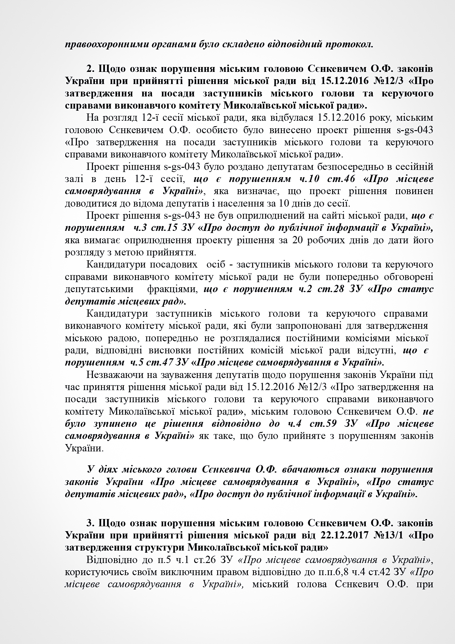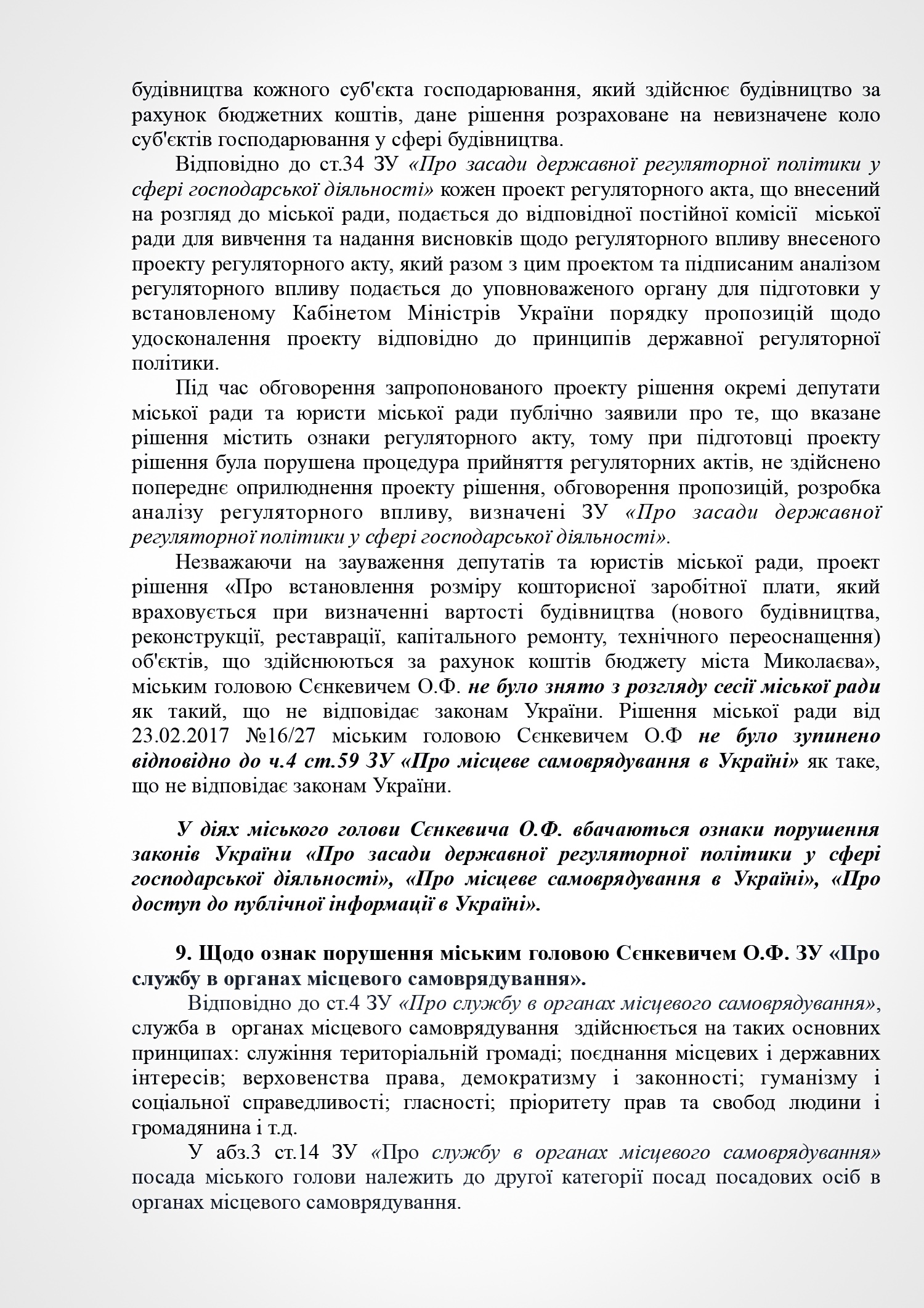 В пояснении к проекту решения субъект подачи документа указывает на признание судом факта нарушения Николаевским городским головой Александром Сенкевичем части 3 статьи 184 Кодекса законов о труде Украины, а также наличие в действиях Николаевского городского головы признаков нарушений части 2 статьи 19, статьи 43, статьи 1291 Конституции Украины; части 3 статьи 21 пункта 8 статьи 36, части 3 статьи 184 Кодекса законов о труде Украины; части 1, 2 статьи 172-7 Кодекса Украины об административных правонарушениях; статьи 366, 382 Уголовного кодекса Украины; части 10 статьи 46, части 5 статьи 47, части 4 статьи 59, части 1 статьи 59-1 Закона Украины «О местном самоуправлении в Украине»; части 2 статьи 28 Закона Украины «О статусе депутатов местных советов»; пунктов 2,3 части1 статьи 28 части 2 статьи 35 Закона Украины «О предотвращении коррупции»; части 3 статьи 15 Закона Украины «О доступе к публичной информации в Украине»; ст. 34 Закона Украины «Об основах государственной регуляторной политики в сфере хозяйственной деятельности»; статьи 4, 11 Закона Украины «О службе в органах местного самоуправления».