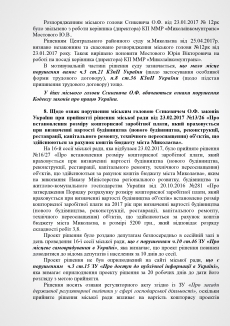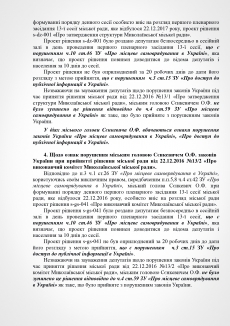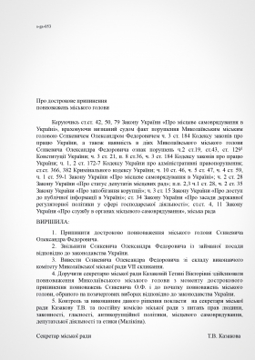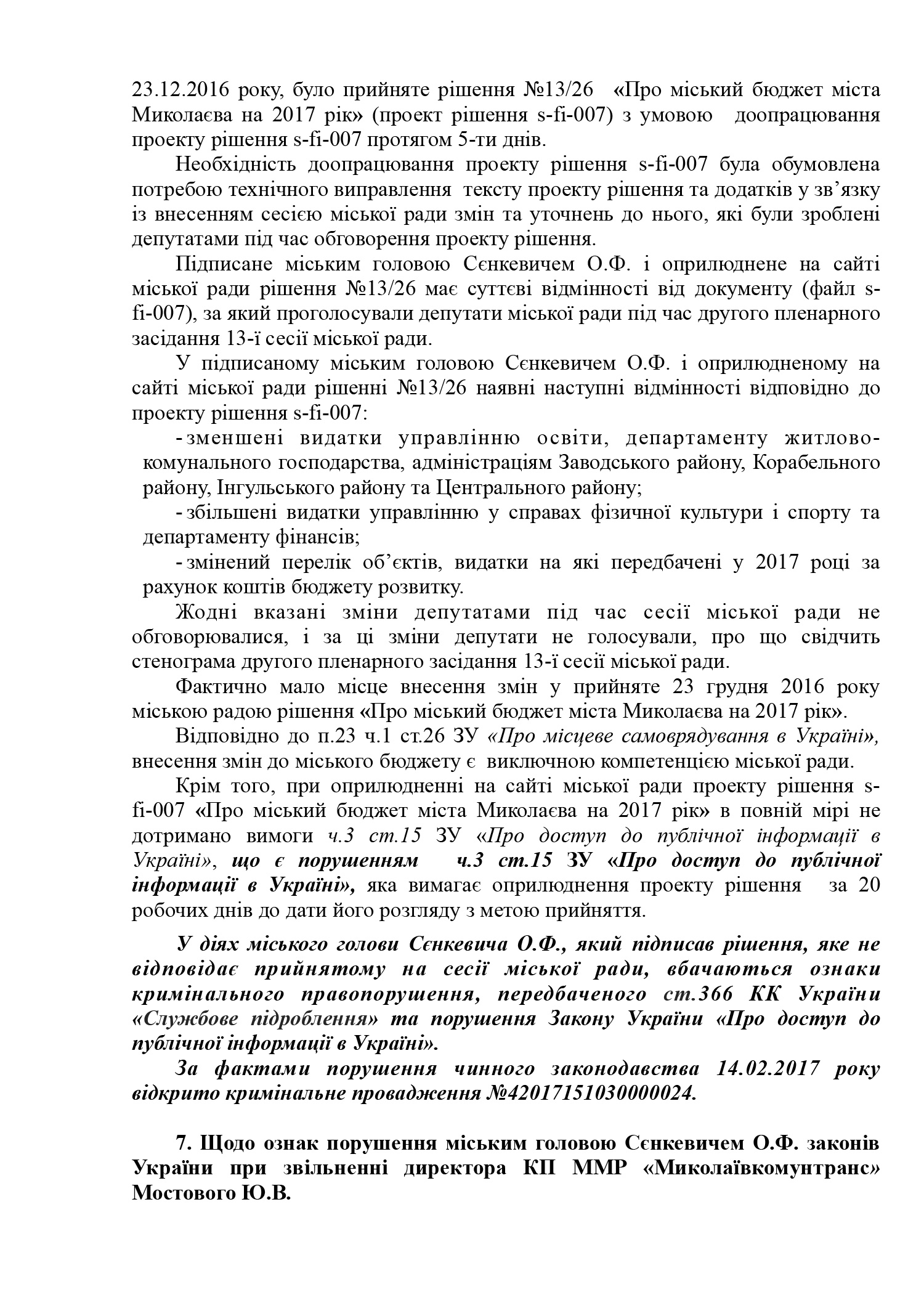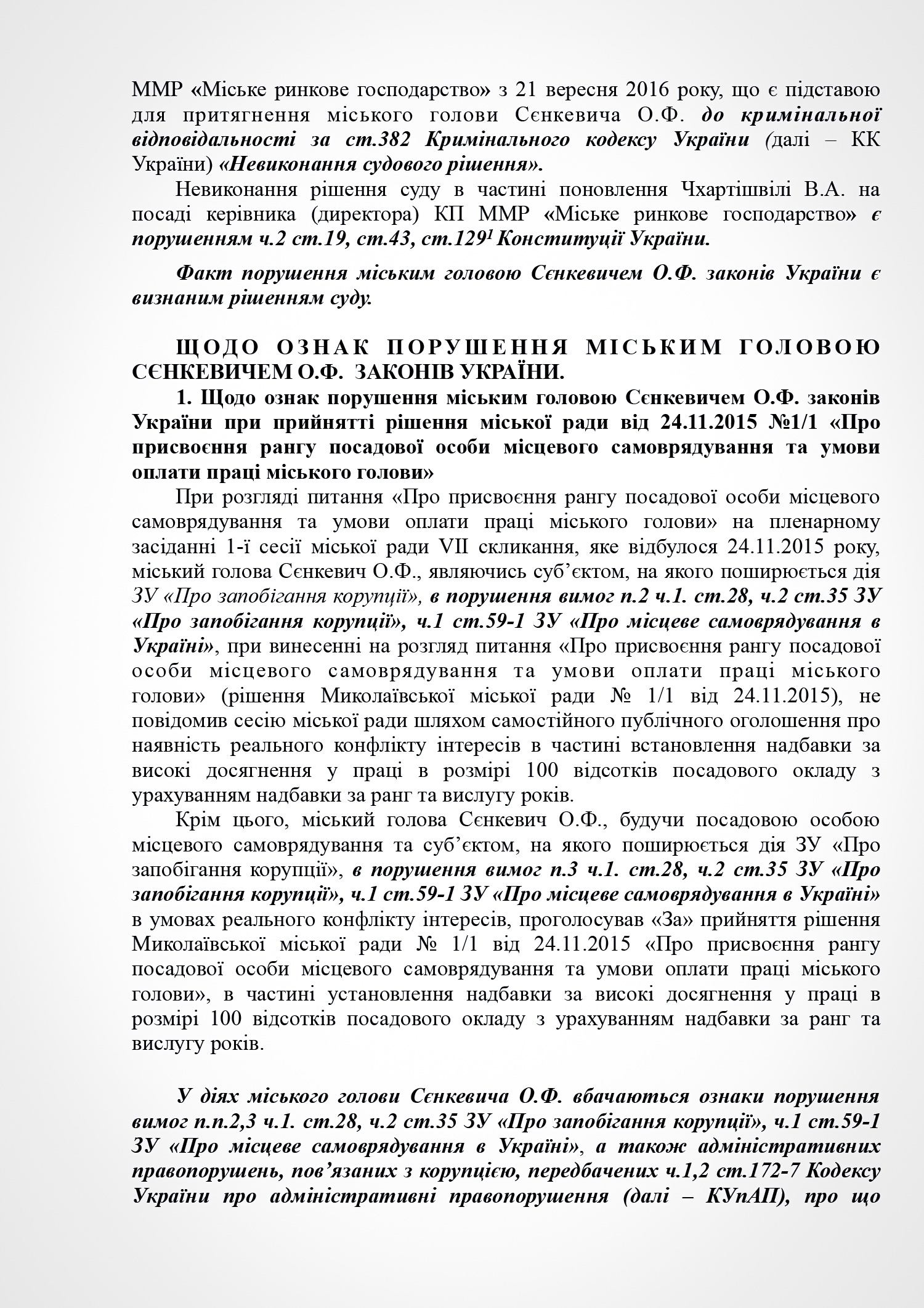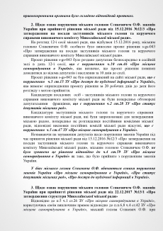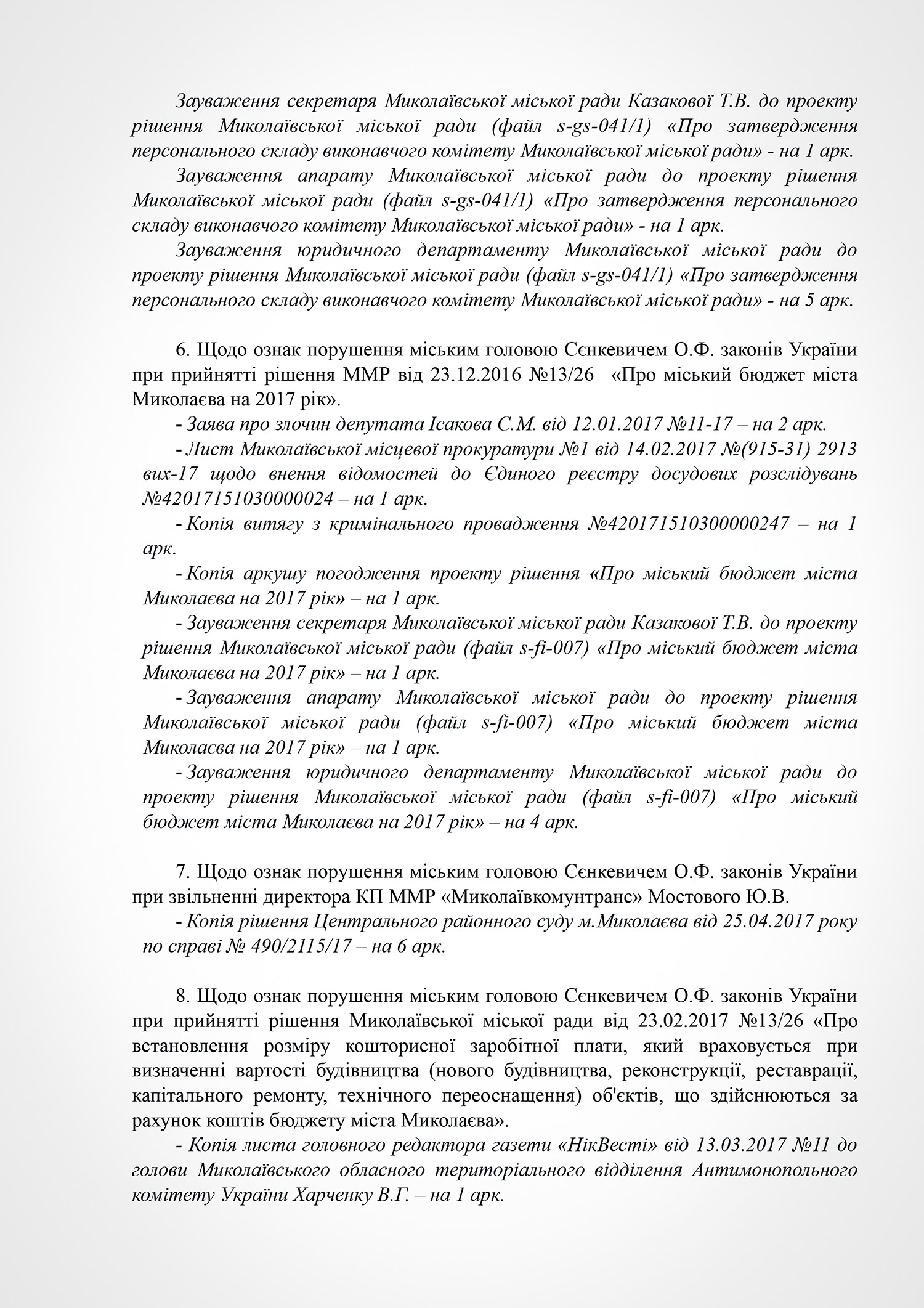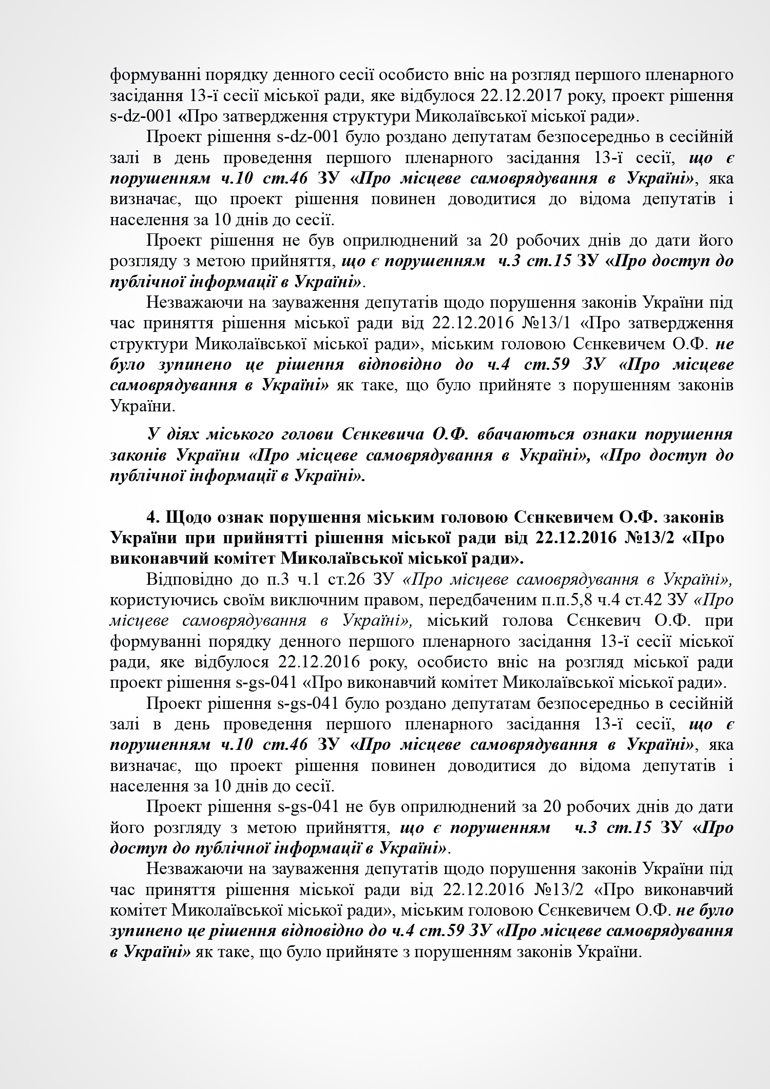 В пояснении к проекту решения субъект подачи документа указывает на признание судом факта нарушения Николаевским городским головой Александром Сенкевичем части 3 статьи 184 Кодекса законов о труде Украины, а также наличие в действиях Николаевского городского головы признаков нарушений части 2 статьи 19, статьи 43, статьи 1291 Конституции Украины; части 3 статьи 21 пункта 8 статьи 36, части 3 статьи 184 Кодекса законов о труде Украины; части 1, 2 статьи 172-7 Кодекса Украины об административных правонарушениях; статьи 366, 382 Уголовного кодекса Украины; части 10 статьи 46, части 5 статьи 47, части 4 статьи 59, части 1 статьи 59-1 Закона Украины «О местном самоуправлении в Украине»; части 2 статьи 28 Закона Украины «О статусе депутатов местных советов»; пунктов 2,3 части1 статьи 28 части 2 статьи 35 Закона Украины «О предотвращении коррупции»; части 3 статьи 15 Закона Украины «О доступе к публичной информации в Украине»; ст. 34 Закона Украины «Об основах государственной регуляторной политики в сфере хозяйственной деятельности»; статьи 4, 11 Закона Украины «О службе в органах местного самоуправления».