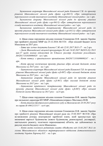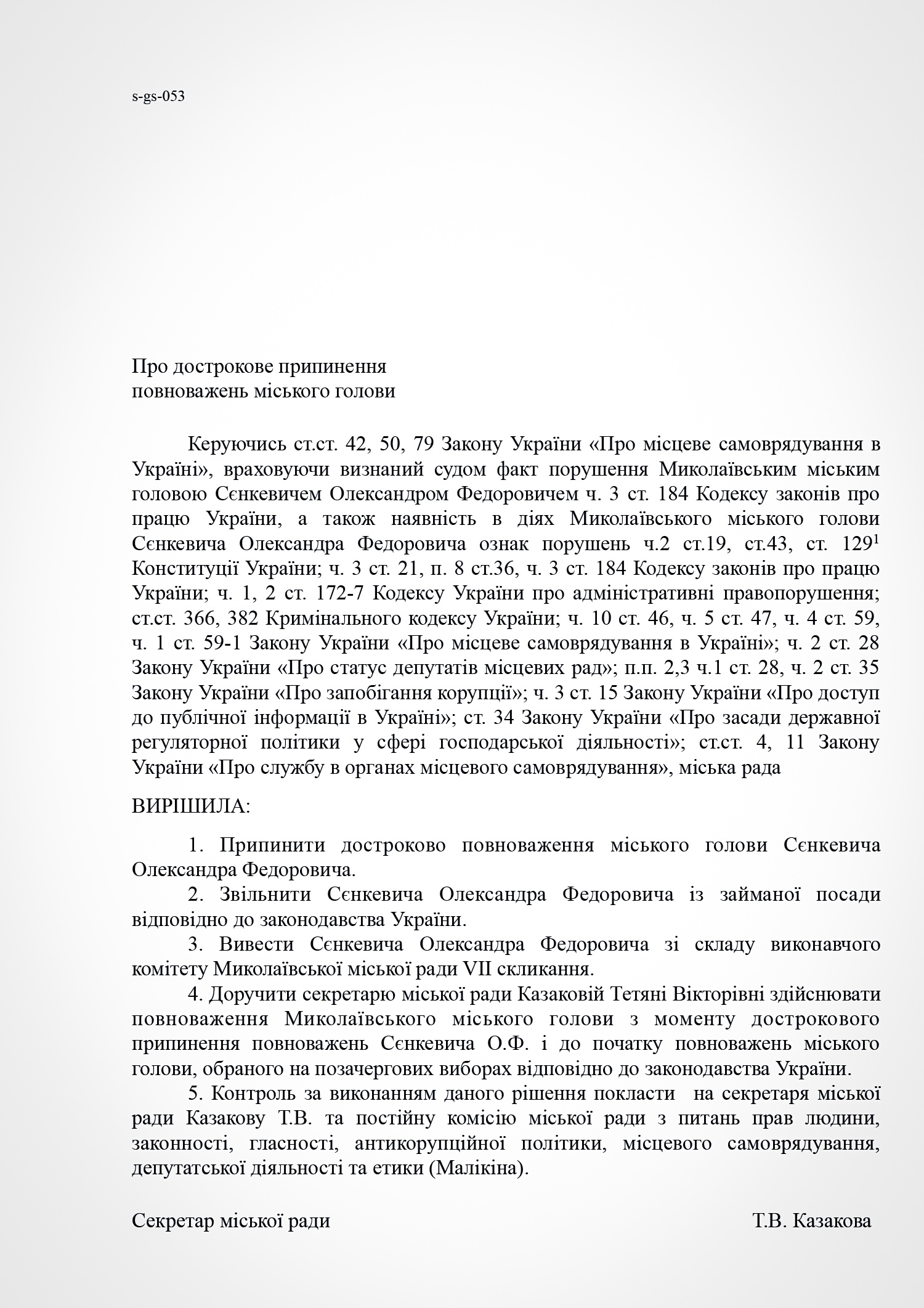 4. Поручить секретарю городского совета Казаковой Татьяне Викторовне осуществлять полномочия Николаевского городского головы с момента досрочного прекращения полномочий Сенкевича А.Ф. и до начала полномочий городского головы, избранного на внеочередных выборах в соответствии с законодательством Украины.