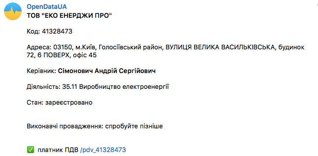 Согласно данных Единого реестра физических лиц-предпринимателей и юридических лиц ООО «Еко Енерджи Про» зарегистрировано в Киеве два месяца назад, в мае 2017 года с уставным капиталом в 10 тысяч гривен. Учредителями компании являются киевляне Андрей Сергеевич Симонович и Анита Юрьевна Ющак. Согласно данным реестра, Андрей Симонович возглавляет еще 12 предприятий, часть из которых зарегистрирована по тому же адресу, что и «Еко Енерджи Про».