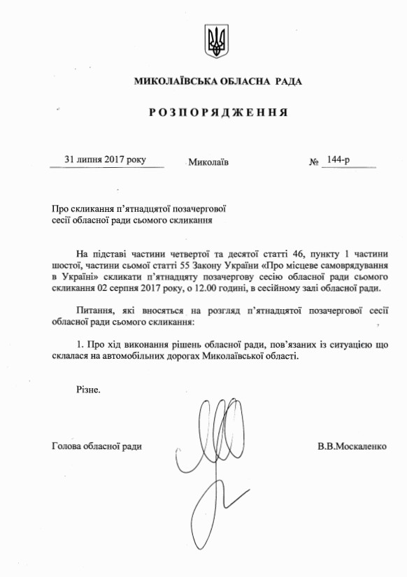 Указывается, что на внеочередной сессии будет рассмотрен вопрос о выполнении решений областного совета, связанных с ситуацией, которая сложилась на автомобильных дорогах Николаевской области, а также блок «Разное».