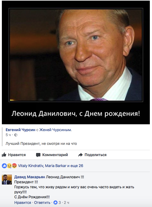 Народный депутат Украины от партии «Блок Петра Порошенко «Солидарность» Давид Макарьян поздравил с днем рождения второго президента Украины Леонида Кучму и похвастался тем, что живет с ним по соседству.