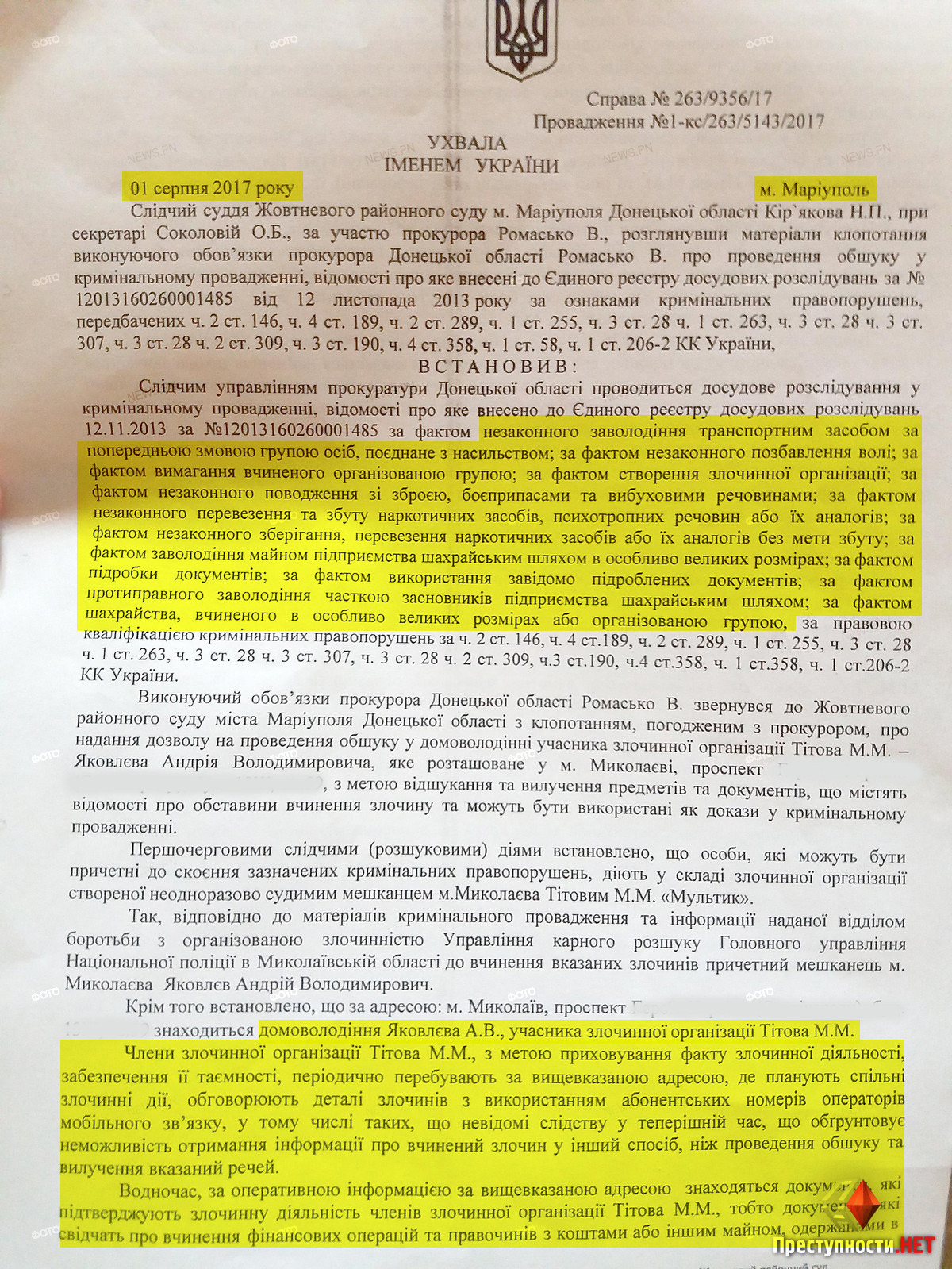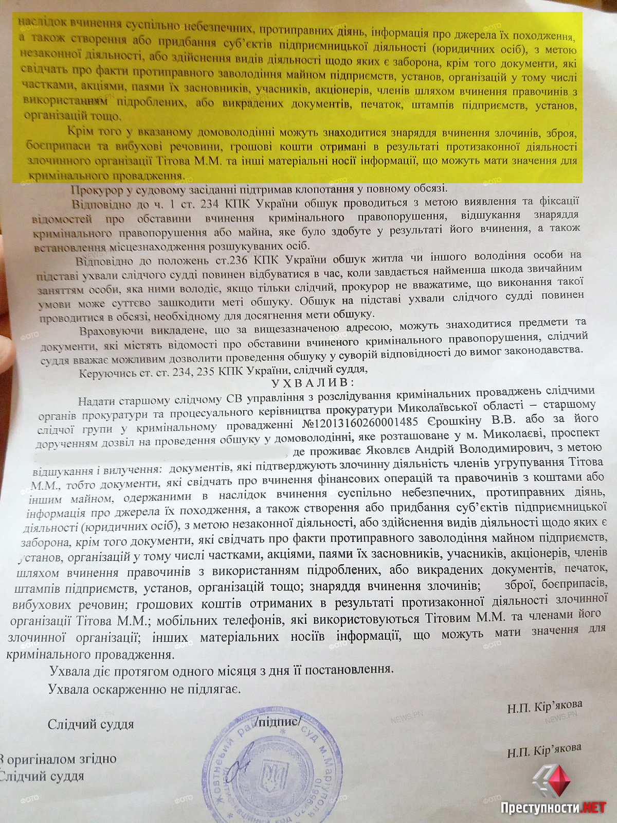 Вместе с тем, издание «Преступности.НЕТ» опубликовало копию постановления, согласно которому был проведен обыск в доме депутата Николаевского горсовета от «Оппозиционного блока» Андрея Яковлева. Из него следует, что Андрея Яковлева подозревают в том, что он является «участником преступной группировки Титова М.М.», и что в его доме может находиться информация, подтверждающая преступную деятельность данной организации.