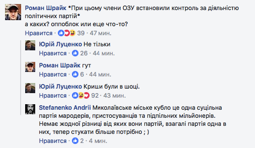 При этом, в комментариях под своей публикацией в Facebook, Юрий Луценко заявил, что ОПГ Михаила Титова влияла не только на политическую партию «Оппозиционный блок». Он не сообщил названия других политических сил, о которых идет речь в его публикации, но отметил, что «крыши были в шоке».