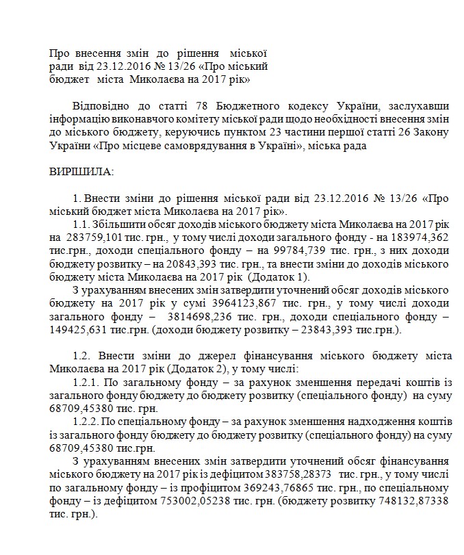 В среду, 13 сентября, исполком Николаевского городского совета одобрил и вынес на рассмотрение сессии городского совета проект решения о внесении изменений в бюджет города на 2017 год.