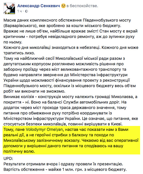 Министр инфраструктуры Украины Владимир Омелян рассказал, что ждет от мэрии Николаева документов относительно Варваровского моста, об аварийности и срочной необходимости ремонта которого сегодня заявил Николаевский городской голова Александр Сенкевич.