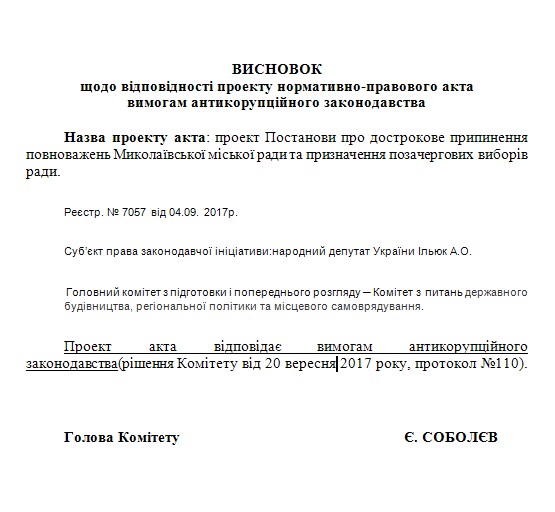 Проект постановления народного депутата Украины, главы Николаевской областной организации партии «Відродження» Артема Ильюка «О досрочном прекращении полномочий Николаевского городского совета и назначении внеочередных выборов совета» соответствует антикоррупционному законодательству.