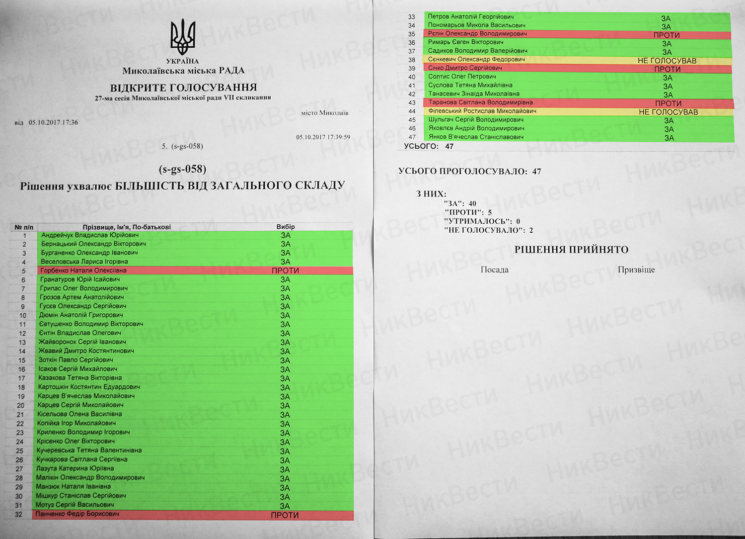 В формулировке «признать неудовлетворительной» работу мэра Николаева «за» проголосовали 40 депутатов, против 5, не голосовали двое. Против проголосовали Наталья Горбенко, Федор Панченко, Александр Репин, Дмитрий Сичко и Светлана Таранова из фракции «Самопомощь». Не голосовали депутат Ростислав Филевский и мэр Александр Сенкевич.