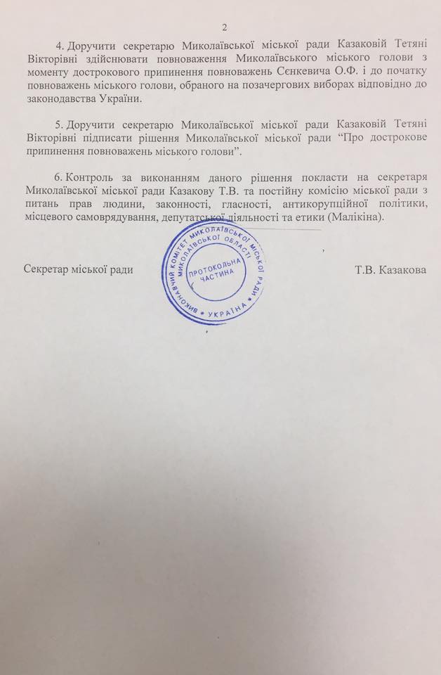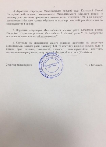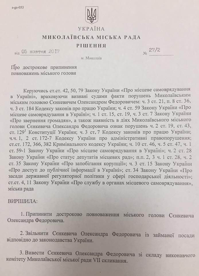 Секретарь Николаевского городского совета Татьяна Казакова подписала решение сессии горсовета от 5 октября о досрочном прекращении полномочий мэра Николаева Александра Сенкевича.