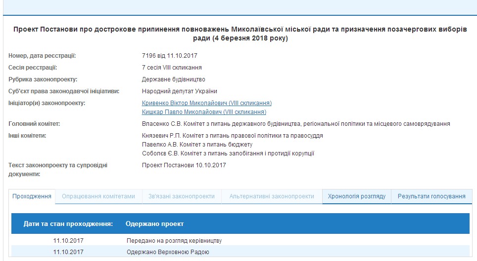 Внефракционные народные депутаты Украины Виктор Кривенко и Павел Кишкарь сегодня, 11 октября, зарегистрировали проект Постановления №7196 о досрочном прекращении полномочий Николаевского горсовета и назначении внеочередных выборов на 4 марта 2018 года.