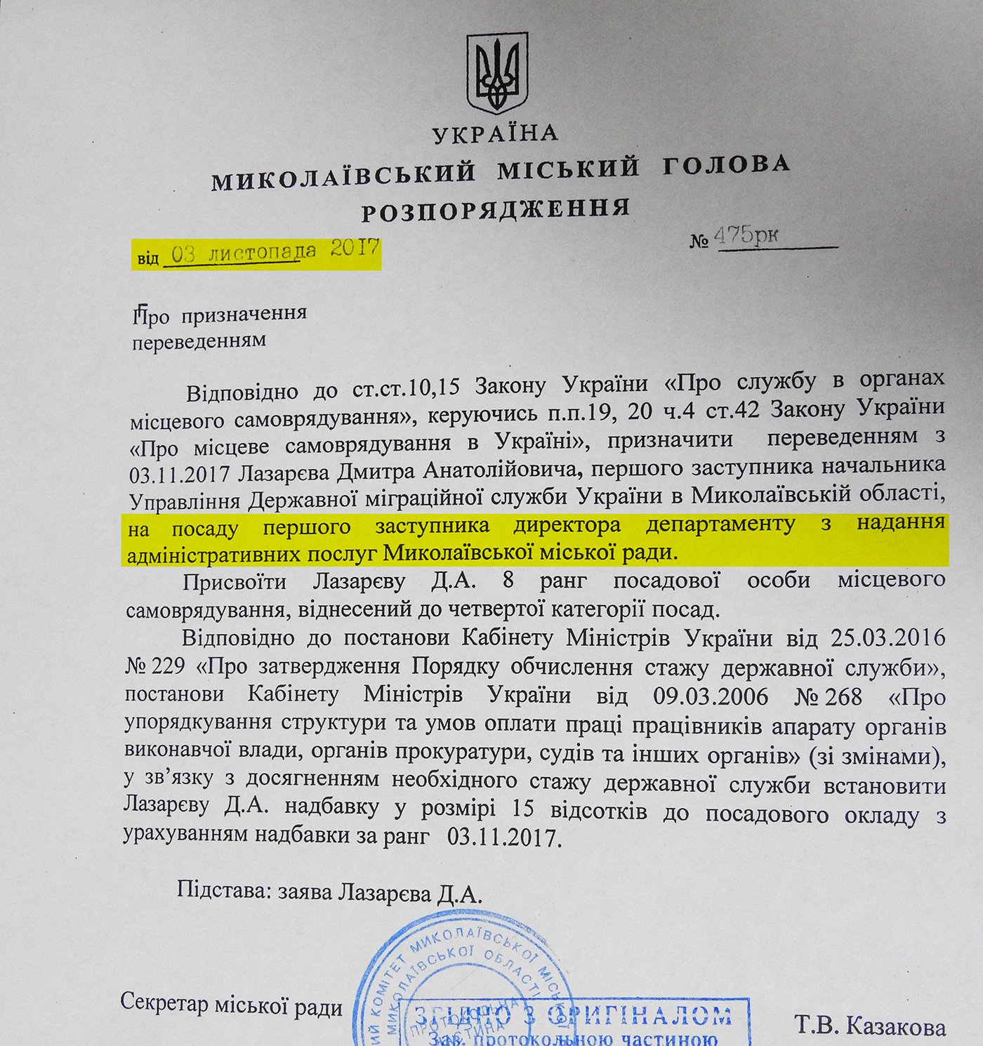 Бывший заместитель главы Государственной миграционной службы Украины в Николаевской области Дмитрий Лазарев, который уже две недели управляет работой городского центра по предоставлению административных услуг, только вчера был назначен на должность первого заместителя руководителя соответствующего Департамента в мэрии Николаева.