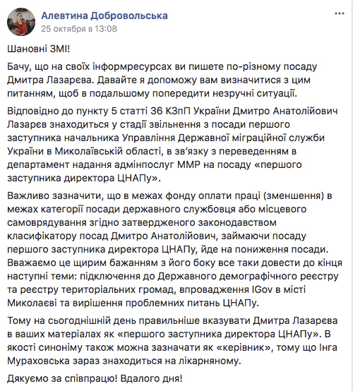 При этом, уже 25 октября сотрудница управления аппарата Николаевского горсовета Алевтина Добровольская в социальной сети Facebook сообщила, что на самом деле Дмитрия Лазарева назначают на должность первого заместителя директора Департамента, и предложила СМИ называть его «руководителем» ЦПАУ.