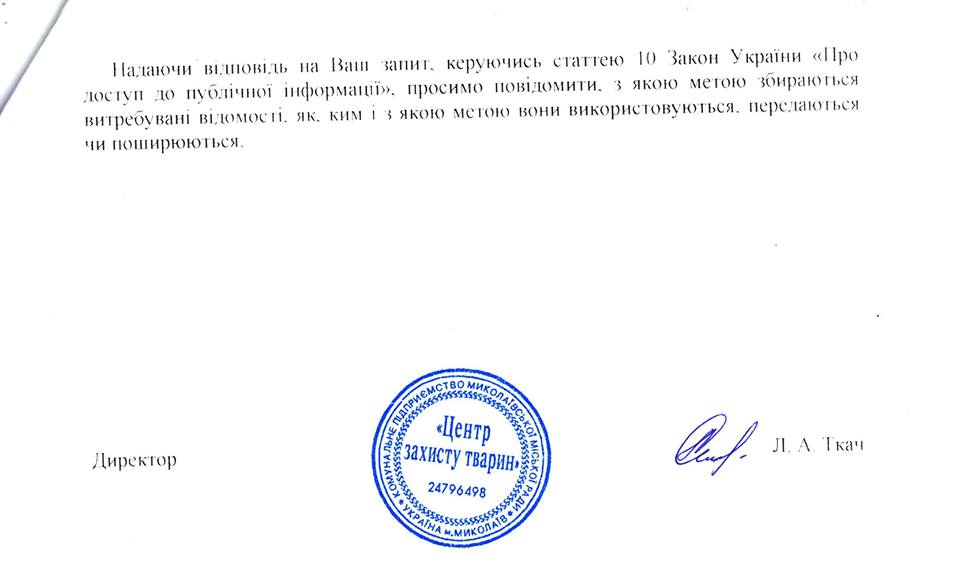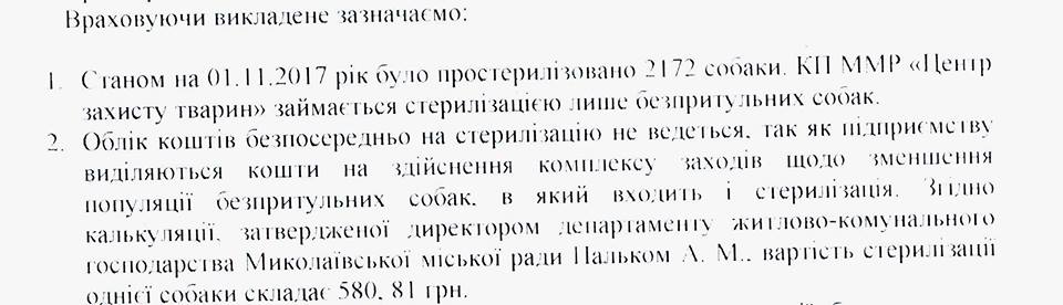 Журналист отправил на предприятие запрос с вопросами о том, сколько было стерилизовано животных за 10 месяцев 2017 года и сколько на это было потрачено средств. В ответ ему написали, что за указаный период было стерилизовано 2 тысячи 172 собаки, однако общую сумму средств, которые были потрачены, написать не смогли, поскольку учет расходов на стерилизацию не ведется. Предприятию известно только то, что стоимость стерилизации одной собаки составляет 580 гривен, 81 копейку.