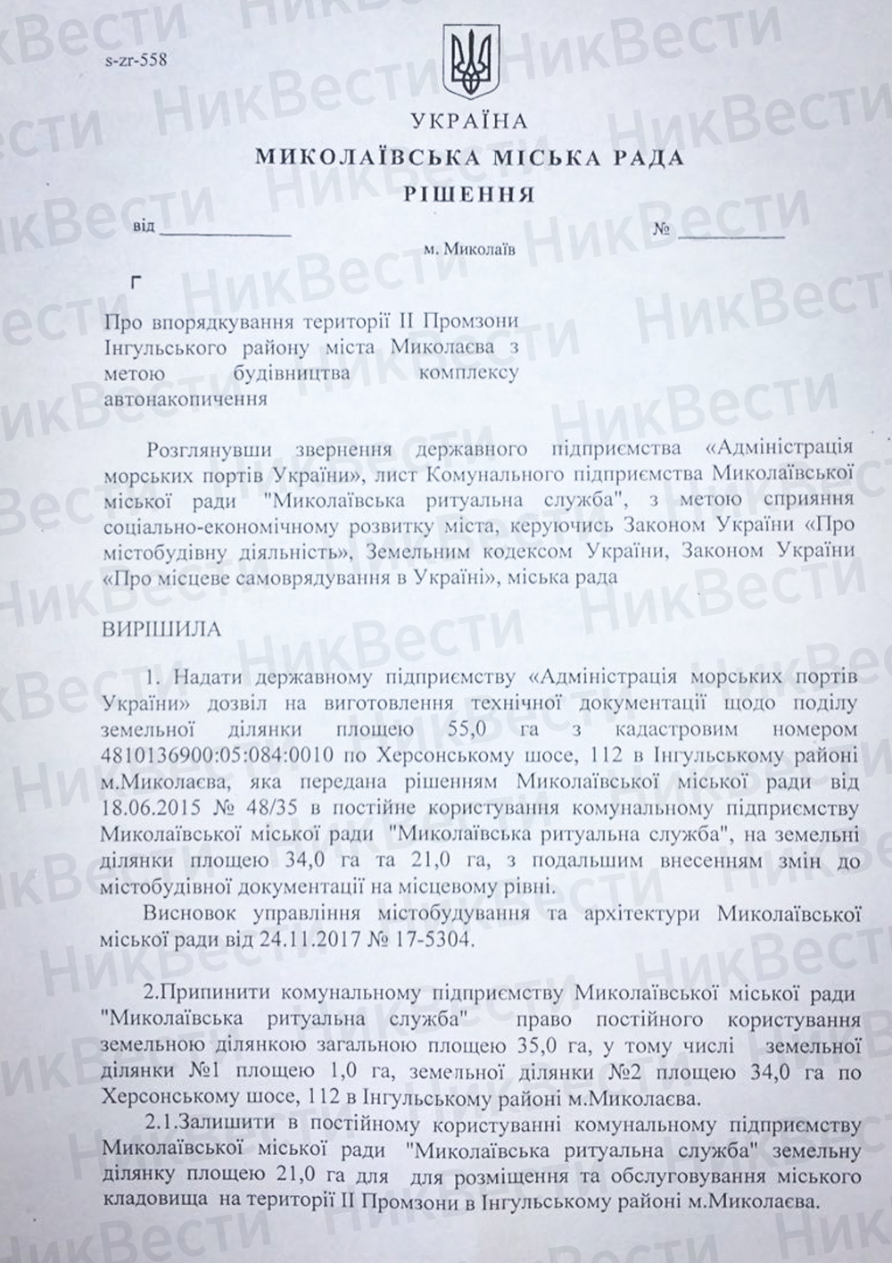 Ранее постоянная комиссия по вопросам градостроительства, архитектуры и строительства, регулирования земельных отношений и экологии согласовала передачу АМПУ 35 гектаров земли по улице Херсонское шоссе, 112, где мэрия Николаева планирует строительство городского кладбища.