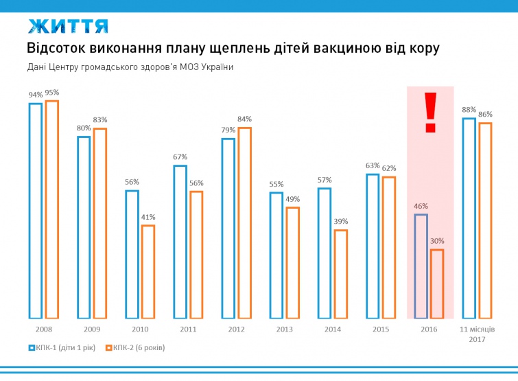 За 12 месяцев 2017 года согласно оперативным данным Центра общественного здоровья, в Украине зарегистрировано 4782 случая заболевания корью (1292 случая - взрослые и 3490 - дети).