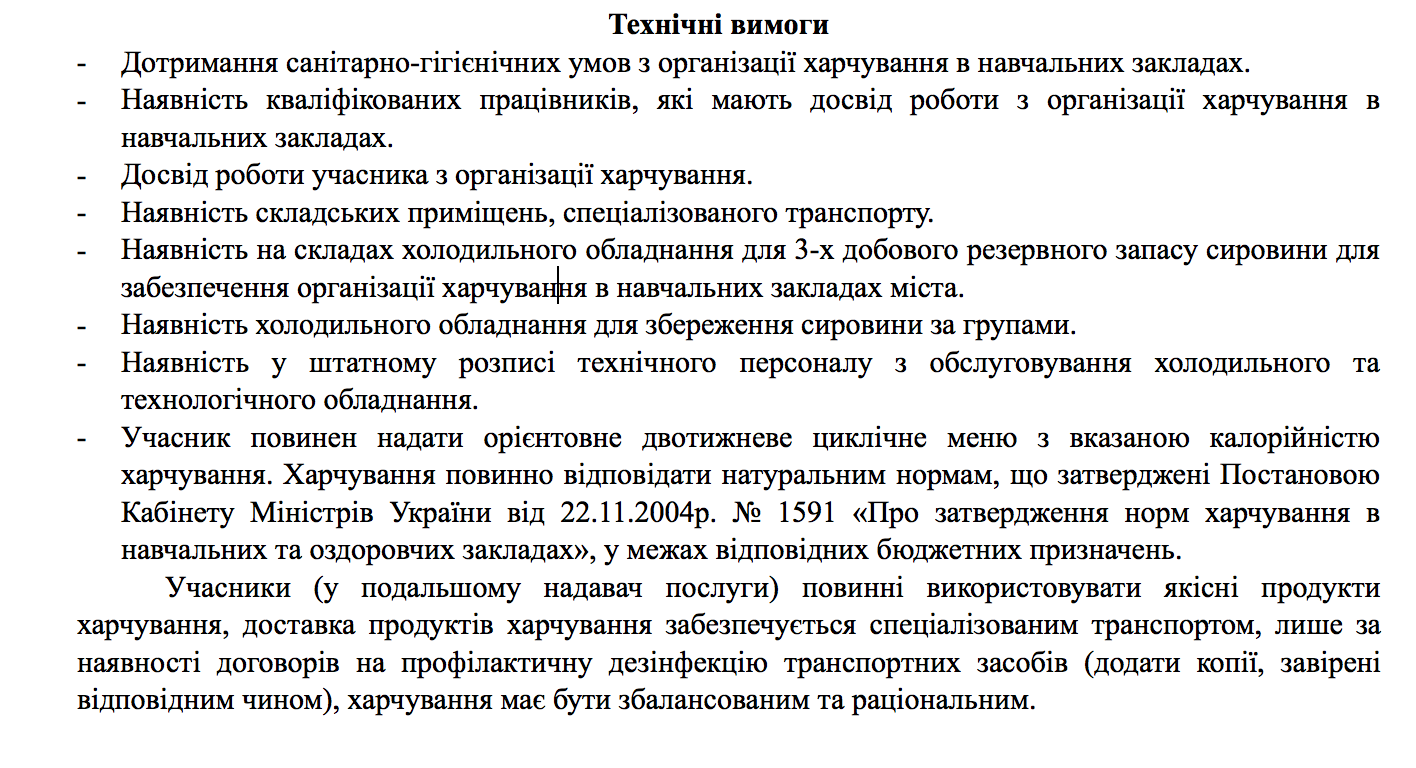 Согласно техническим требованиям к компании, оказывающей услуги по организации питания в учебных заведениях, предприятие должно, в частности, иметь опыт работы в качестве участника по организации питания. У компании должны быть складские помещения, специализированный транспорт, холодильное оборудование для трехсуточного резервного запаса продуктов.