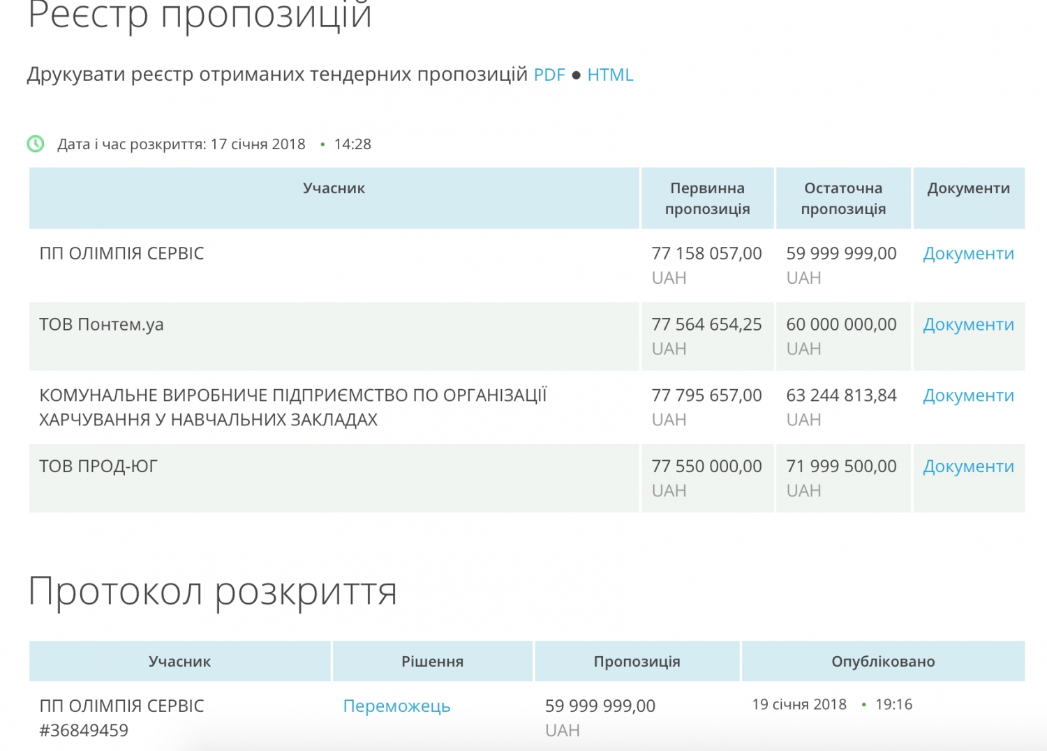 Окончательное предложение ЧП «Олімпія Сервіс» составило 59 миллионов 999 тысяч, а КП по организации питания предложило за свои услуг 63 миллиона 244 тысячи 813 гривен.