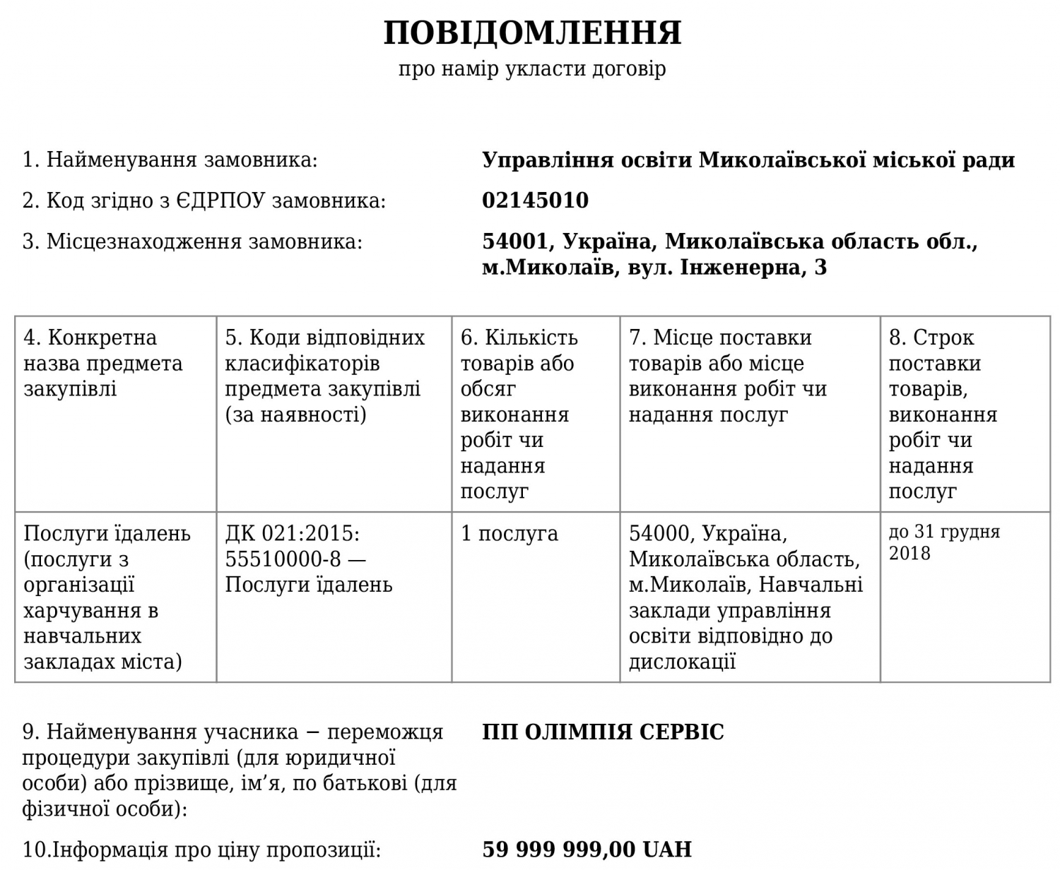 19 января Управление образования Николаевского горсовета опубликовало сообщение о намерении заключить договор с предприятием «Олімпія Сервіс» на оказание услуг о организации питания в учебных заведениях Николаева до 31 декабря 2018 года. Предприятие будет оказывать услуги по организации питания в 127 учебных заведениях - школах и детских садах Николаева.