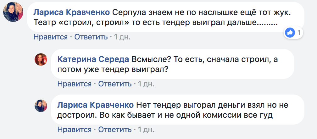 — Стерпула знаем не понаслышке, ещё тот жук. Театр «строил, строил» то есть тендер выиграл, а дальше… Тендер выиграл, деньги взял, но не достроил. Во как бывает, и не одной комиссии, все гуд,- написала Лариса Кравченко.
