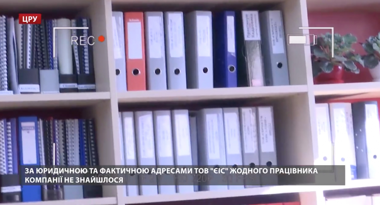 В сюжете говорится, что ни по юридическому, ни по фактическому адресам компании ни одного работника предприятия найти не удалось. Оказалось, что по юридическому адресу компания уже не находится, а в офисе по фактическому месту нахождения нет ничего кроме папок с надписью «ТОВ «ЄІС».
