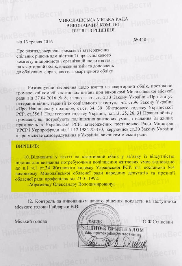 Об этом свидетельствует выдержка из решения исполнительного комитета Николаевского городского совета от 13 мая 2016 года за подписью Александра Сенкевича.