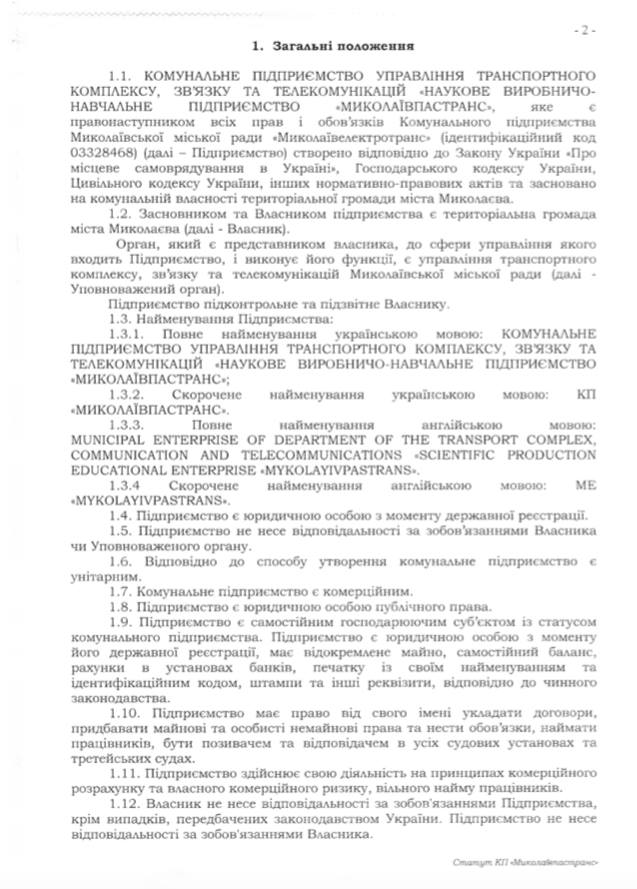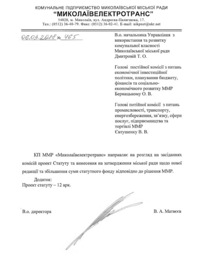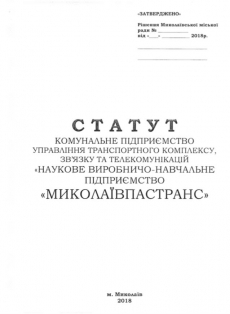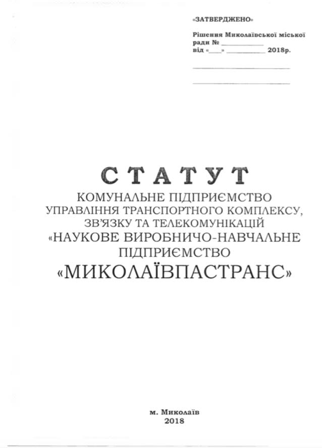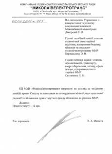 В Николаеве коммунальное предприятие «Николаевэлектротранс» предложило членам постоянной комиссии Николаевского городского совета по вопросам промышленности, транспорта, энергосбережения, связи, сферы услуг, предпринимательства и торговли утвердить Статут КП «Научное производственно-учебное предприятие «Николаевпастрас»».