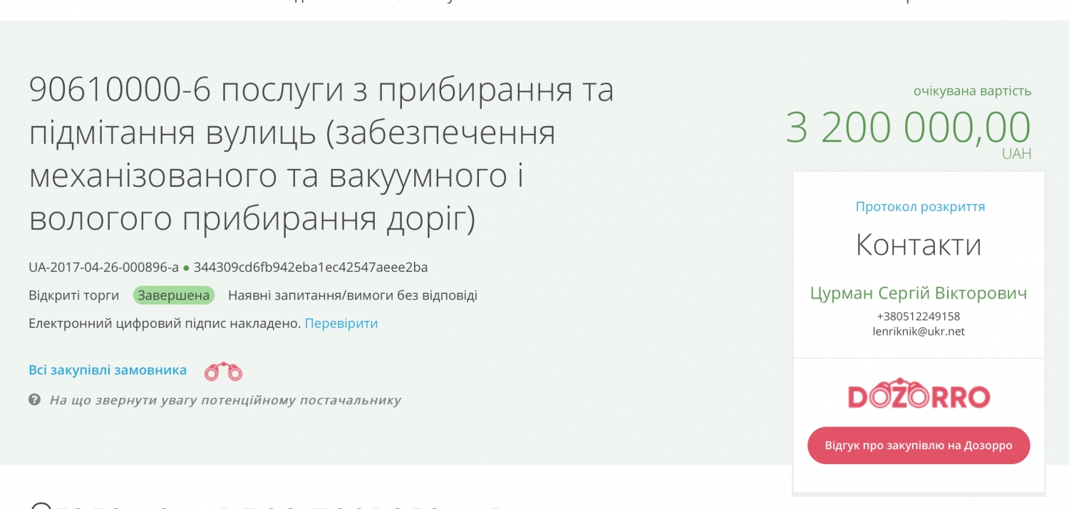 Объявление о закупке было подано только 26 апреля 2017 года, а сам аукцион состоялся 15 мая. Проигравшая торги одесская компания ООО «Коммунал Сервис» блокировала процедуру закупки этой услуги в Антимонопольном комитете до конца июня 2017 года.