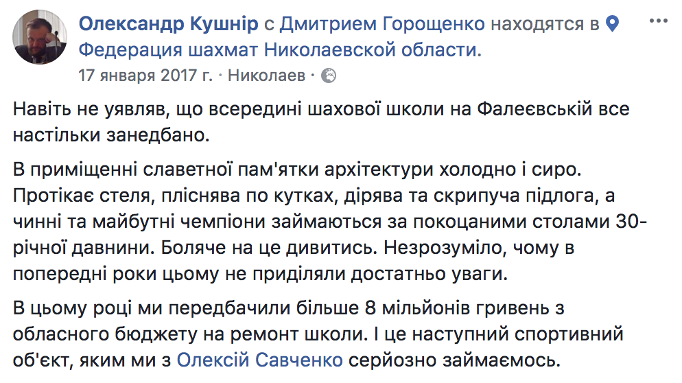 — Даже не представлял, что внутри шахматной школы на Фалеевской все настолько запущено. В помещении знаменитой достопримечательности архитектуры холодно и сыро. Протекает потолок, плесень по углам, дырявый и скрипучий пол, а действующие и будущие чемпионы занимаются за покоцанными столами 30-летней давности. Больно на это смотреть. Непонятно, почему в предыдущие годы этому не уделяли достаточно внимания. В этом году мы предусмотрели более 8 миллионов гривен из областного бюджета на ремонт школы. И это следующий спортивный объект, которым мы с Алексеем Савченко серьезно занимаемся, - написал Александр Кушнир 17 января 2017 года.
