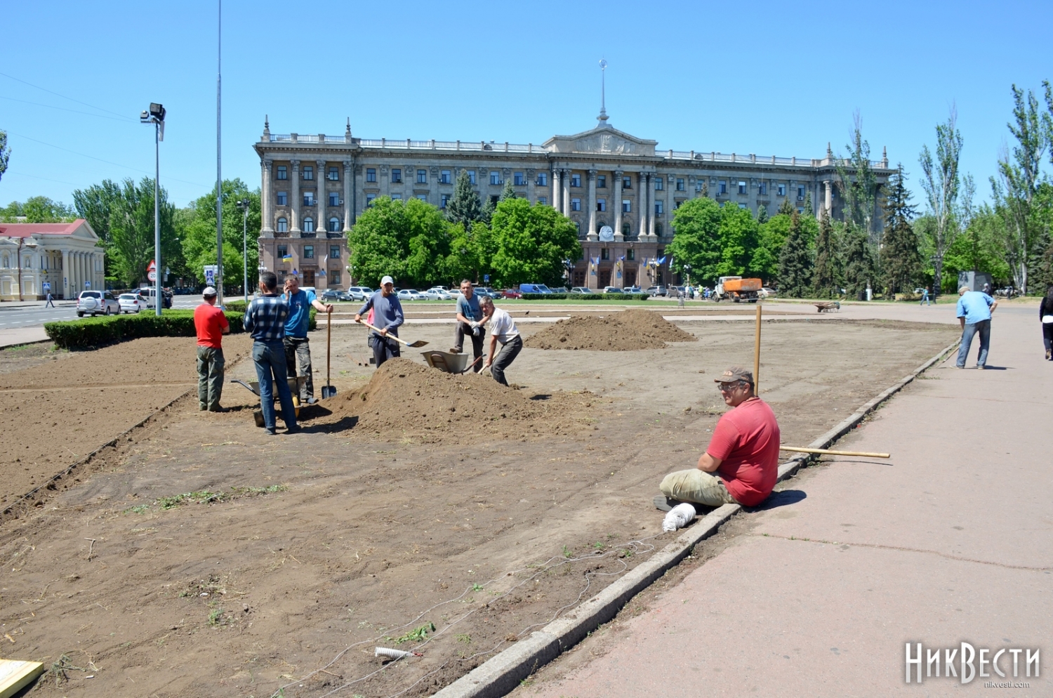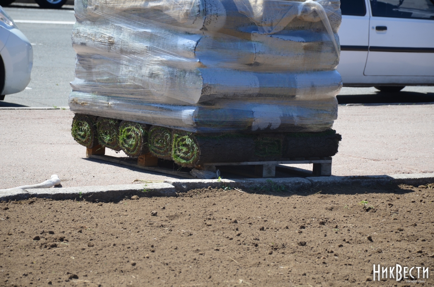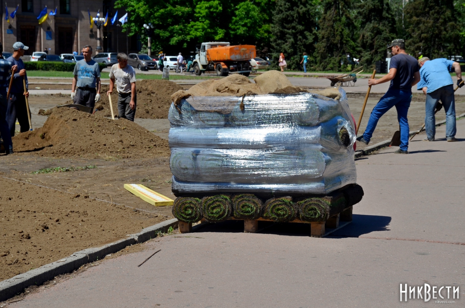В Николаеве, на Соборной площади сегодня, 11 мая, начались работы по укладке зеленого газона.