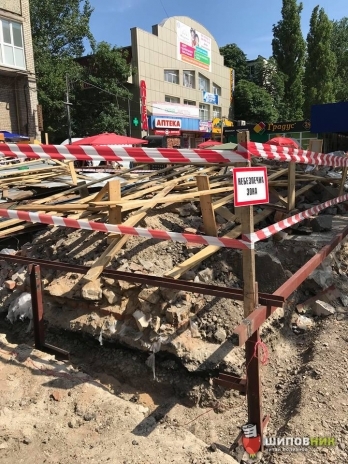 На данный момент строительные работы по какой-то причине ведутся без забора. При этом, люди заняли прилегающий тротуар для торговли там своими товарами.
