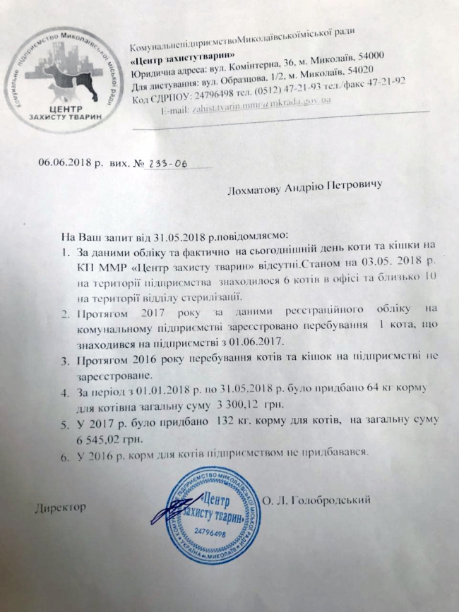 Коммунальное предприятие Николаевского городского совета «Центр защиты животных» за 2017 год и первый квартал 2018 года в период, когда директором предприятия была уволенная Людмила Ткач, закупило корма для кошек на более 10 тысяч гривен при том, что фактически котов и кошек на предприятии не было.