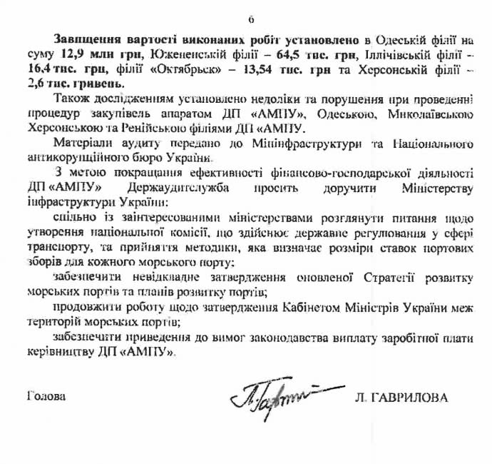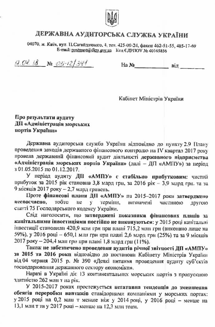 Об этом говорится в письме Государственной аудиторской службы Украины в Кабинет Министров Украины о результатах аудита ГП «АМПУ», копию которого опубликовала Украинская Правда.