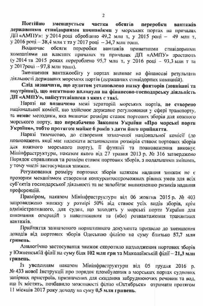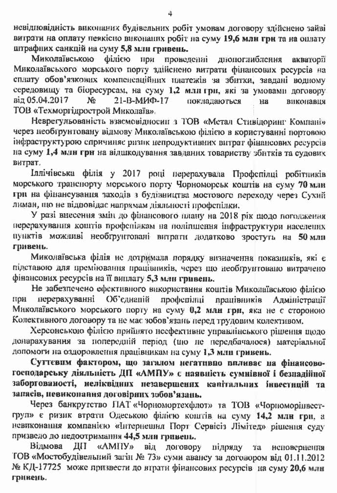 «В целом из-за принятия руководством Николаевского филиала в июле 2013 года управленческих решений относительно заключения с портовыми операторами бессрочных договоров сервитута на заведомо невыгодных условиях за период с 1 января 2016 по 1 декабря 2017 годов потеряны правовые основания и возможность взыскания с портовых операторов доходов за доступ к причалам на сумму 195 миллионов гривен», - говорится в документе.